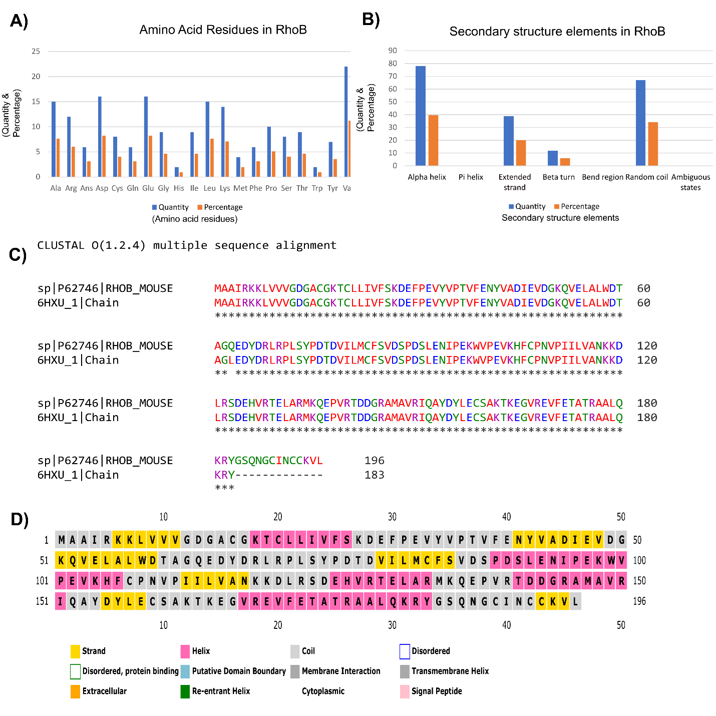 Since X-ray crystallography is considered the most trustable structure and its related study is time-consuming, costly, and tiresome which needed extensive effort and equipment; on the other hand, in silico study gives some opportunities within a short period considering a few disadvantages. Therefore, to characterize the structural and functional properties of Rho-related GTP-binding protein RhoB and it is encoded by the gene RhoB (Uniprot ID: P62746) consists of 196 amino acid long sequences to investigate its activity. Its subcellular location is the late endosome membrane, Cell membrane, Nucleus. For this purpose, we retrieved desired protein from Universal Protein Resource Knowledge Base (UniprotKB) [24] as a FASTA file format and due to the unavailability of a 3-D structure in the Research Collaboratory for Structural Bioinformatics (RCSB) protein data bank (PDB) [25].