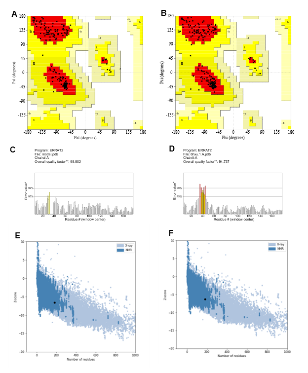 The quality of the model was validated to examine its credibility and consistency with a few tools. PROCHECK analysis quantifies the available zone of residues presented by checking the Ramachandran plot [36]. Along with, the VERIFY-3D [37] program to identify the compatibility of the atomic model (3D) with its amino acid sequence (1D). All of that analysis was brought out based on Structure Analysis and Verification Server (SAVES) v6.0. The overall quality factor of the query protein was being checked with the non-bond interaction between each protein, ERRAT [38] tools had been used, and subsequently, PorSA-web [39] program was engrossed in validating and refining to check the native protein folding energy of the model which compared with the energy (potential mean force) derived from a long set of protein structures. Superimposition was checked by UCSF Chimera [31] applied to visualize the similarity the template and model.