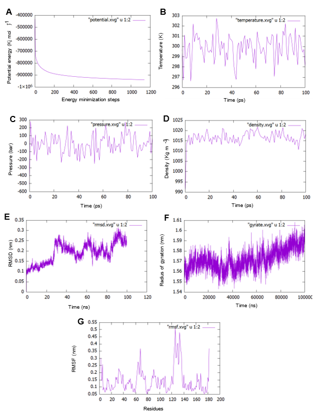 All-atom molecular dynamics (MD) simulations are a powerful tool for investigating biomolecular motion on the pico- to nanosecond time scale. While visualizing an MD trajectory provides qualitative insights into the system, quantitative data that describes or supports these insights are often difficult to obtain [40]. So, It is necessary to know the nutshell of the stability, endurance, and dynamics of the modelled protein MD simulations were led using OPLS-AA force field and flexible water model in GROMACS 2021.2 [41] package continued in Linux OS (Ubuntu20.04 distribution). At that time all atoms of 6hxu.1.A protein were enclosed by a water box called the genion of spc216 water model. When it was being solvated, the system was neutralized with 4Na+ ions. That solvated system then minimized the energy through 5000 steps of the steepest invasion to eradicate the van der Waals contacts initiating a favourable structure for MD simulation. Using the LINCS algorithm [42], all bonds were constrained. Furthermore, the electrostatic bond interactions were elucidated by the particle mesh Ewald (PME) algorithm [43].