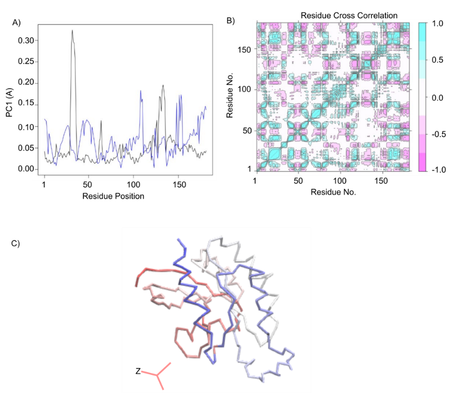 Observing the scree plot of Figure 8, by ranking eigenvectors in order of their eigenvalues, highest to lowest, we got the principal components in order of significance [74]. The first PC accounts for more than one-fourth; of 23.34% of the overall variance. The second PC accounts for 17.95%. Altogether, the first three elements account for 50.88% of the total. From Figure 8 we got pictures que information of three principal components against each other. The conformer plot of all selects is defined by PC1-PC3. Each point represents a structure and the point color indicates the cluster id from a conformational clustering. Here, we can identify 4 coordinates and components clustered together. Highly correlated cells clustered together and such PCA plots are often used to find potential clusters [74]. The extent to which the atomic fluctuations/displacements of a system are correlated with one another can be assessed by examining the magnitude of all pairwise cross-correlation coefficients.
