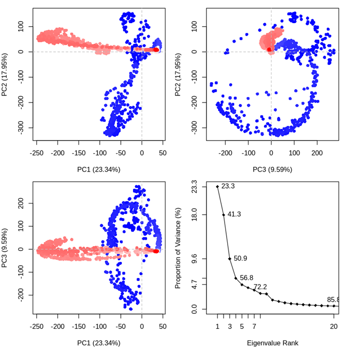 Figure 8. Principal component analysis. For the PCA, the last 100 ns of each trajectory using the Bio3D package implemented in R. The first three eigenvectors, based on complex dominant motion, are extracted and compared. The variance captured by eigenvectors is also shown. Each point represents a structure and the point color indicates the cluster id from a conformational clustering. Projection of the trajectory onto the planes formed by the first three principal components. Conformers are colored according to the k-means clustering: PCA results for our Rho-B trajectory with instantaneous conformations (i.e. trajectory frames) colored from blue to red in order of time. The continuous color scale (from blue to whit to red) indicates that there are periodic jumps between these conformers throughout the trajectory. Below we perform a quick clustering in PC-space to further highlight these distinct conformers. In left side, PCA results for our Rho-B trajectory with instantaneous conformations (i.e. trajectory frames) colored from blue to red in order of time and in right side, Simple clustering in PC subspace.