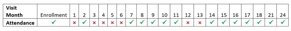 Primary Independent variables: The primary independent variable of interest was an interruption in care and treatment during the study period. An interruption was defined as one or more missed monthly study visits anytime between enrollment and their 24-month visit. Using data from visit records, we measured interruptions in care using two approaches introduced in previous studies [21]: The first was the number of interruptions (of any length) throughout the 2-year study period. The second was the length of interruptions (number of consecutive months missed) and since women experienced multiple interruptions, the length of the longest interruption was used. Figure 1 illustrates a hypothetical patient with 3 interruptions. The first interruption started after enrollment and lasted 1 month. The second interruption started at visit 3 and lasted 4 months. The third and final interruption started at visit 12 and lasted 2 months. The length of the longest interruption was 4 months (months 3-6). The number of interruptions and the longest interruption length were examined as continuous and categorical variables for a total of 4 separate interruption variables. The categorical variables were defined as less than 2 interruptions versus 2 or more interruptions, and less than 2 months versus 2 or more months, respectively [22,23].