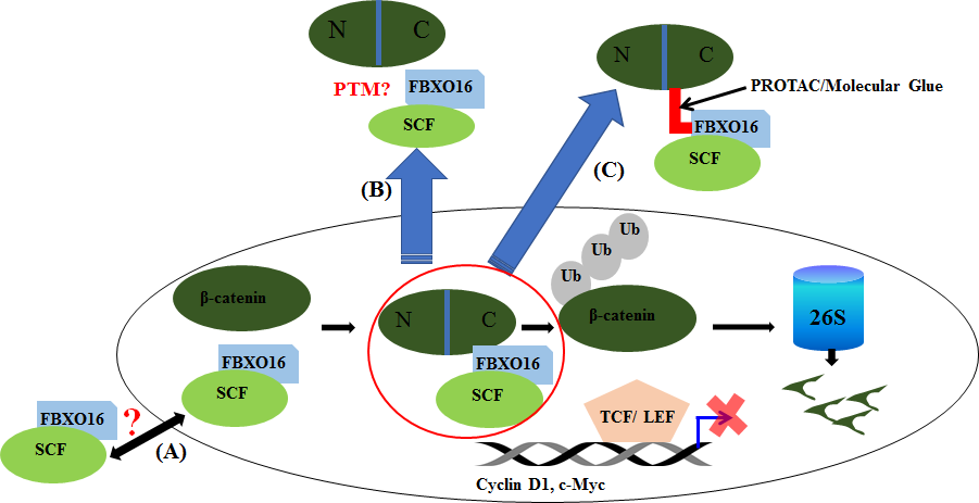 Figure 2. Model describes FBXO16-mediated regulation of nuclear β-Catenin., The prospective: FBXO16 inhibits the oncogenic activity of nuclear β-Catenin by promoting its proteasomal degradation. In future, it will be interesting to address whether FBXO16 shuttles between nucleus and cytoplasm (A), involvement of posttranslational modification (PTM) in FBXO16 in the shuttling process as well as interaction with nuclear β-Catenin (B) and development of PROTACs/Molecular glues to facilitate ablation of nuclear β-Catenin through proteasome mediated degradation (C).