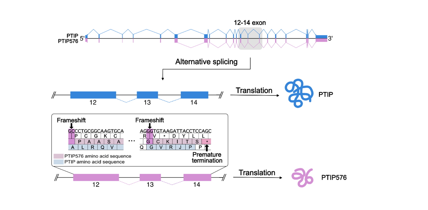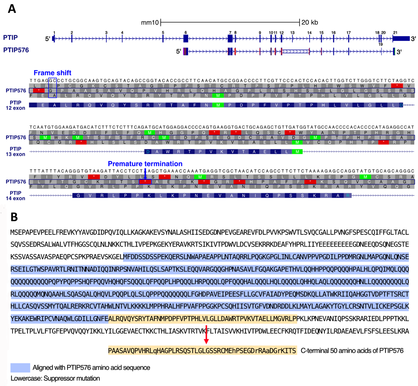 Figure 1. Comparison of the Paxip1 gene and its 2 alternative PTIPs. (A) The DNA and amino acid sequences of PTIP and PTIP576 aligned with the exons of Paxip1 [PMID: 39460617]. PTIP contains exons 1 through 21, whereas PTIP576 includes only exons 6, 7, 8, 9, 10, 11, 12, 14, 15, 16, 17, 20, and 21. The amino acid sequence of PTIP576 aligns with that of exons 12–14. However, in PTIP576, a two-base frameshift mutation occurs in exon 12, resulting in an altered amino acid sequence in exons 12–14 compared to PTIP which results in premature termination in exon 14. (B) Comparison of amino acid sequences of PTIP and PTIP576. The amino acid sequence (uncolored) corresponds to PTIP. The blue region represents the aligned amino acid sequences between PTIP576 and PTIP, while the yellow region indicates the unmatched C-terminal 50 amino acids of PTIP576. The lowercase letters indicate the amino acids that are altered from those encoded by the frameshifted PTIP gene, potentially resulting from a subsequent, intragenic suppressor mutation in PTIP576. This appears to correct the codon so that it can restore the reading frame that was disrupted by the frameshift.