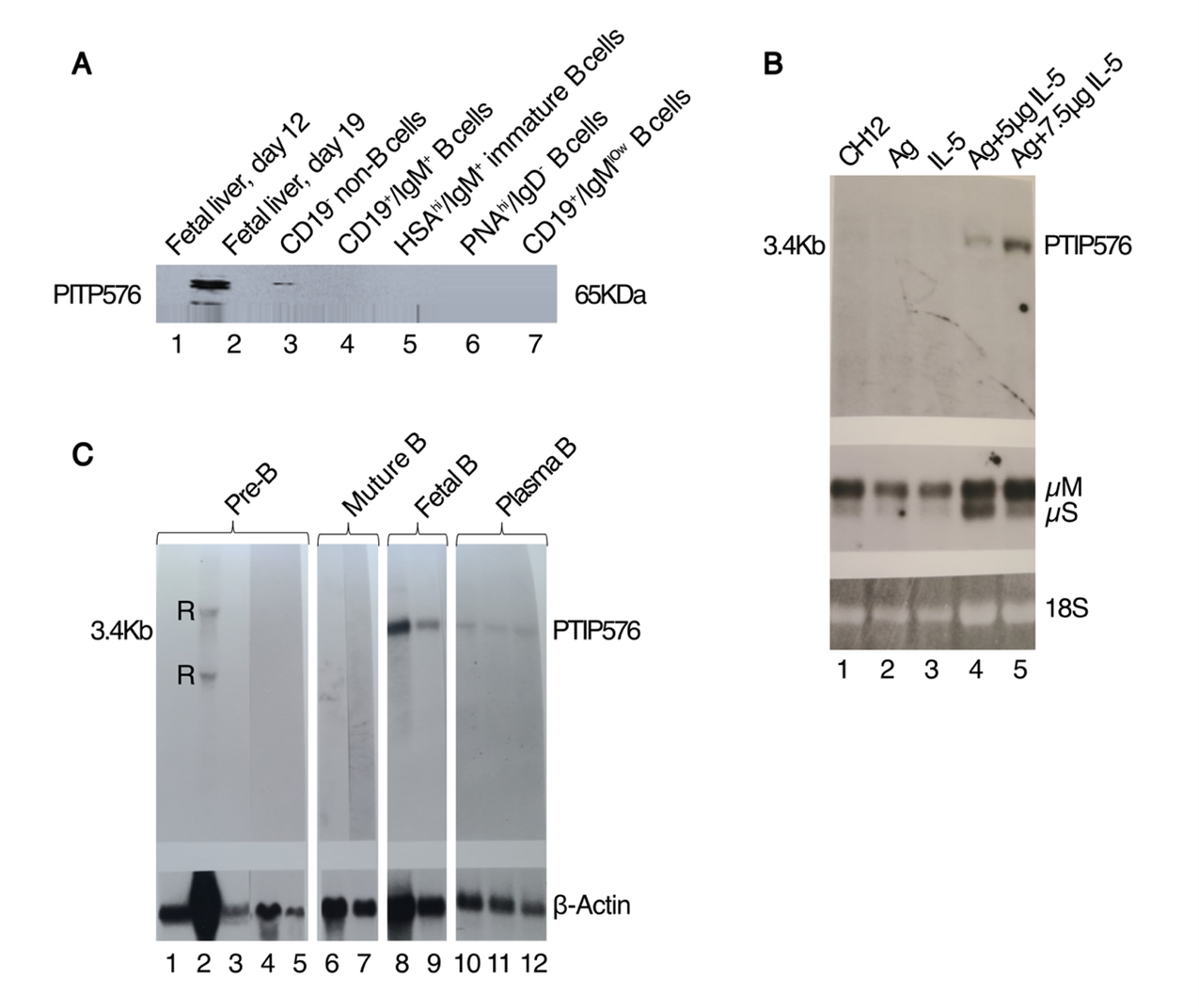 PTIP was shown to be expressed ubiquitously, reaching high to moderate levels in both fetal and adult compartments [1]. However, as shown in the Western analysis of Figure 3A, expression of endogenous PTIP576 was detected in fetal liver E19 CD19+IgM+ B lymphocytes, but not in E12, nor in CD19- non-B cells, HSAhi/IgM+ immature B cells, nor PNAhi/IgD- germinal center B cells.