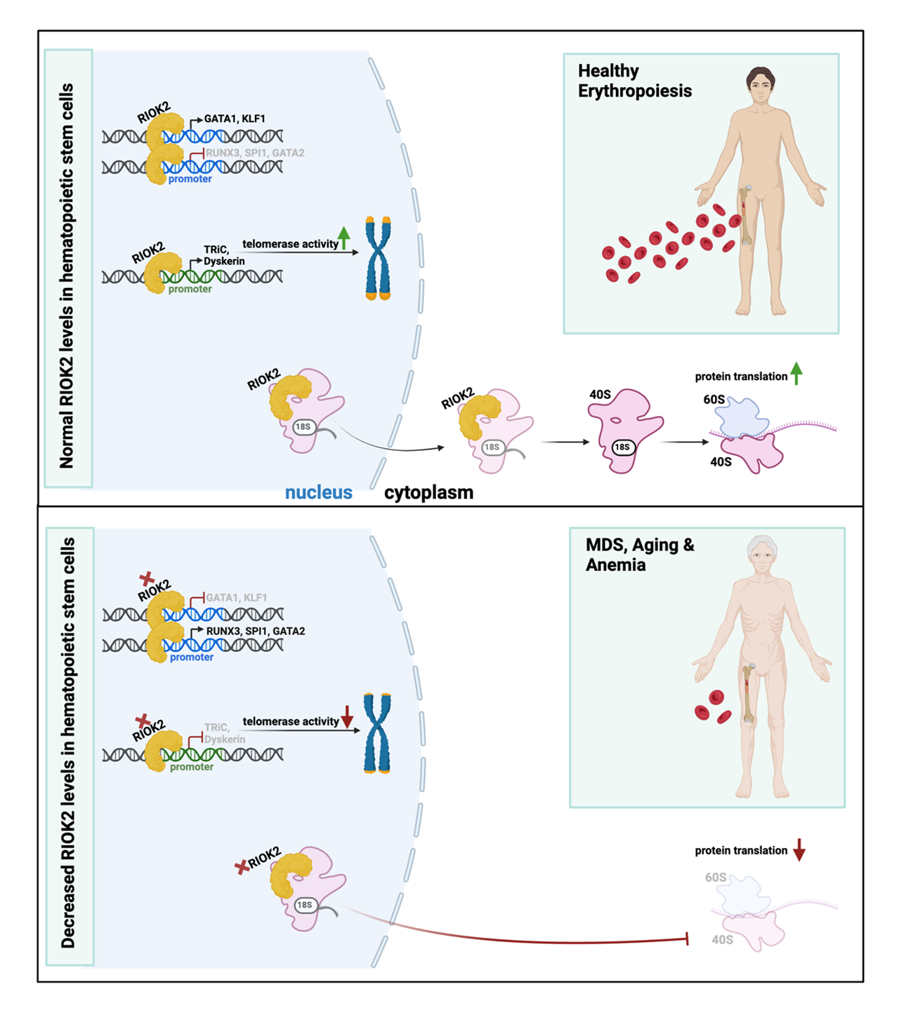 Taken together, these findings highlight RIOK2 as a direct link between telomere shortening and anemia associated with aging and related hematological disorders. The bifunctional roles of RIOK2 as a kinase and a transcription factor underscore its extensive regulatory influence over erythropoiesis, with effects on cytoplasmic translation, gene expressions of key hematopoietic transcription factors and telomere homeostasis. This newly described role of RIOK2 as an upstream regulator of the less studied components of telomerase complex (TRiC and dyskerin) also shifts attention towards the importance of the transcriptional regulation of these complexes to maintain telomerase activity. This not only addresses a gap in the current understanding of telomere biology, but also opens a novel perspective on aging and related hematological disorders.