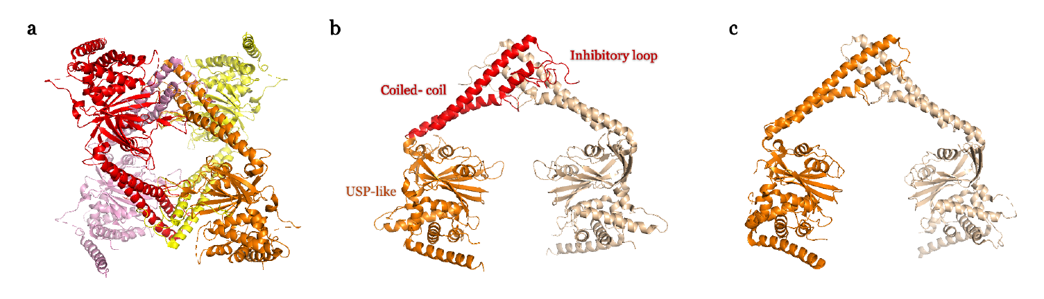 So far in the USP family, no deubiquitinating enzymes other than USP25 have been found to have this tetrameric auto-inhibitory function, but there are other examples with auto-inhibition situations, such as in USP14. According to cryo-electron microscopy and related structural studies, it has been found that the autoinhibited USP14 apoenzyme has a low catalytic activity, but after binding to the proteasome, USP14 is activated and its activity considerably increased [8-10]. Besides, the active site of USP7 can switch between active and inactive state through interaction with its C-terminal ubiquitin-like domain. The active structure involves a rearrangement of the catalytic domain of USP7 and increases the activity by 100 times [11,12]. A similar allosteric regulation also occurs in USP4. The DUSP-Ubl domain at the N-terminal of USP4 is an essential part of the full catalytic activity of USP4. DUSP promotes the release of ubiquitin by interfering with the mechanism, thereby accelerating catalytic conversion [13]. Similarly, Ubp8 singly is a catalytically inactive and needs to be allosterically activated by other subunits of the SAGA complex [14,15].