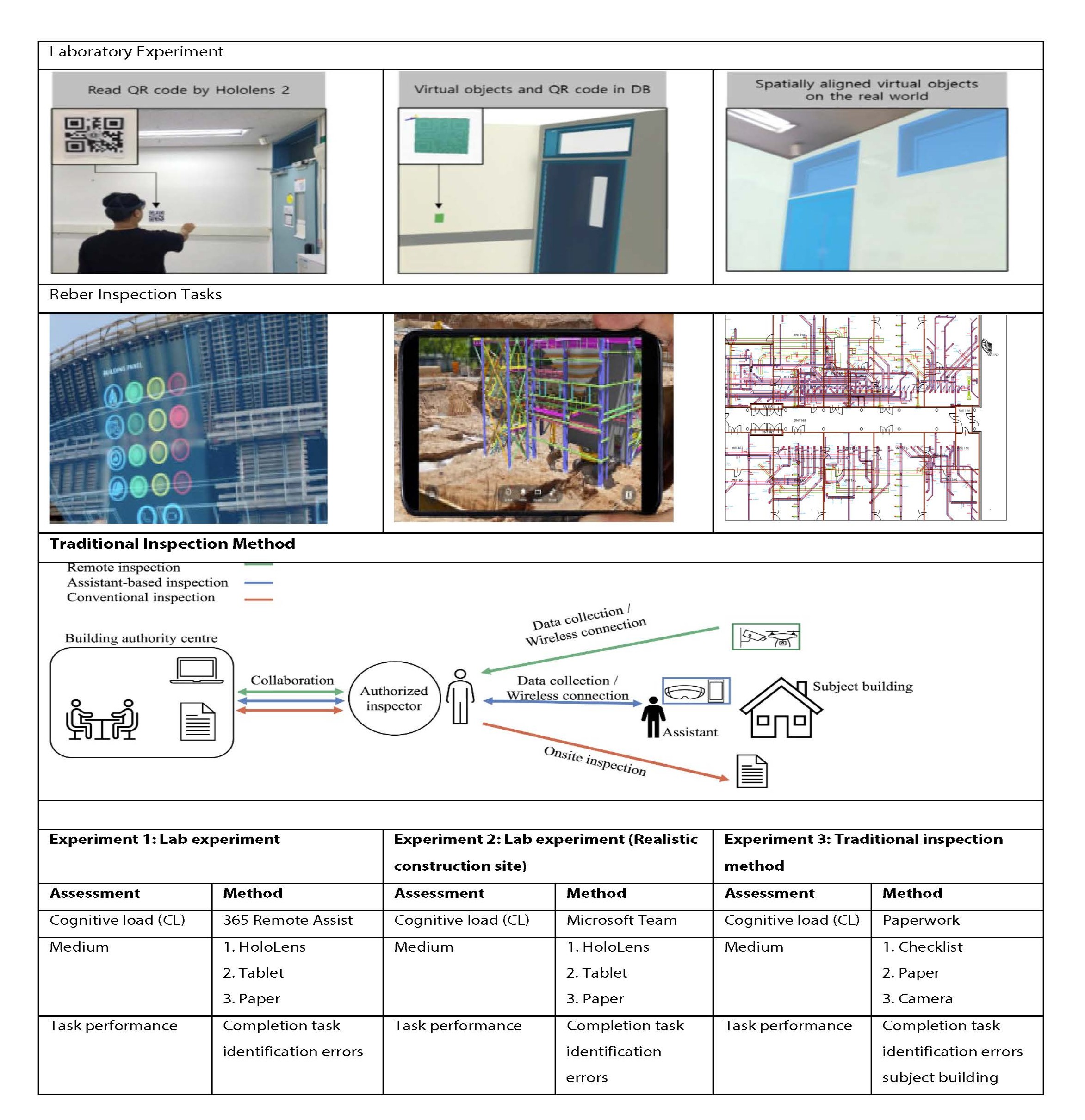 - To quantitatively assess the inspection accuracy, measured by error count, of HMDs (Hololens), handheld devices (Tablets), and traditional methods (Checklist, Camera, Paper) in a controlled experimental setting.