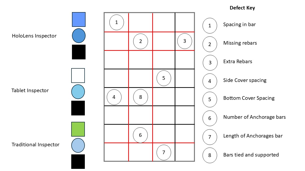 A mixed-factorial research design underpinned the study's results. It is essential to understand that the context in which the experiments were carried out (Lab, Realistic Site, Traditional) was a between-subjects factor, meaning that each participant participated in only one of these settings. In this study, the inspection medium was a within-subjects factor, i.e., each participant used all media according to their specific situation during the inspection. Using a Latin square design to control order and learning effects ensured a completely balanced sequence of media presentations. In addition, the media trials were conducted on a structurally identical but different rebar specimen with the same eight types of errors. This was to avoid memorization of identical fault locations.