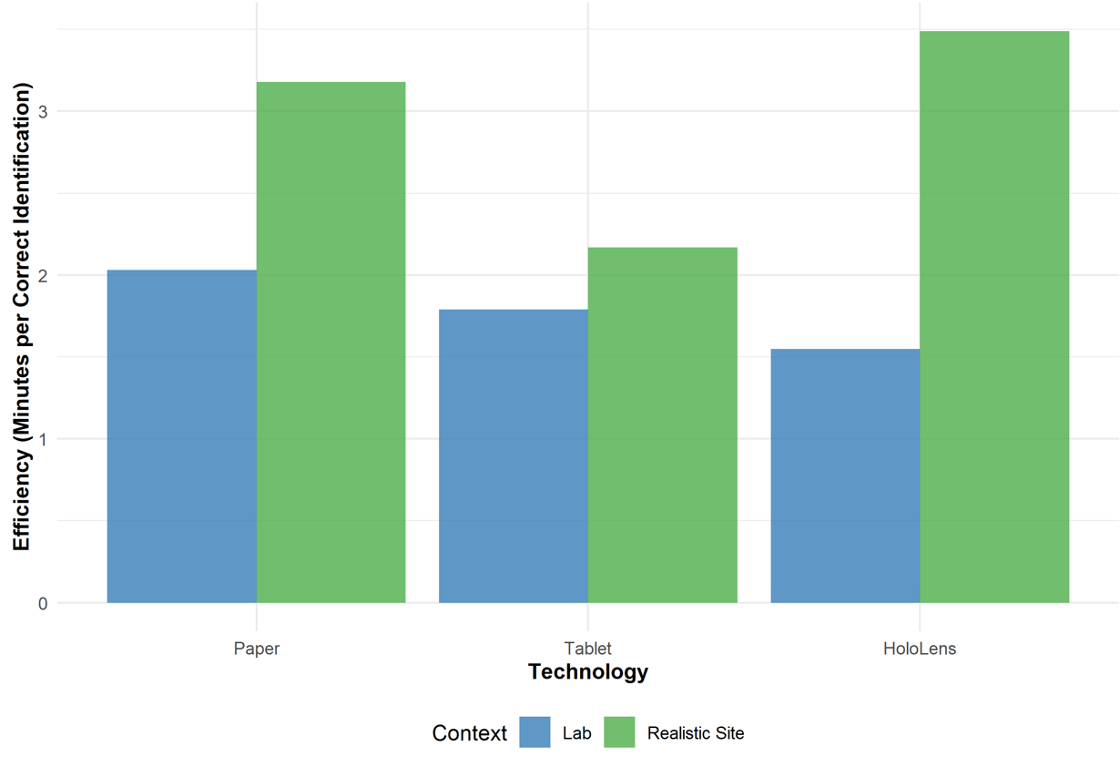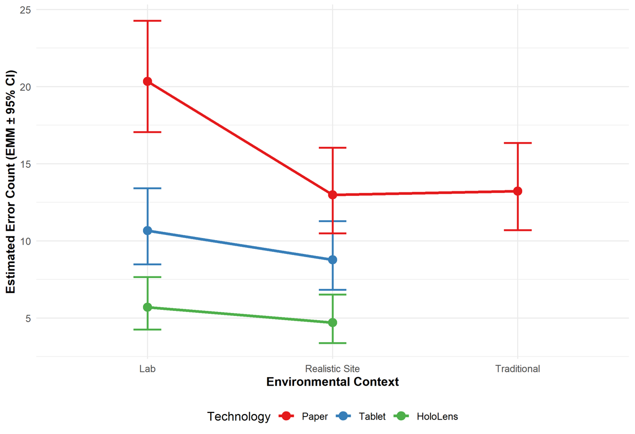 Figure 4 illustrates the context-dependent nature of technological performance by plotting the Estimated Marginal Means of error counts across a range of experimental contexts. The similarities and differences in the technology lines indicate a high level of interaction between the medium and the experiment type. There has been no degradation in HoloLens performance in laboratory or field tests.