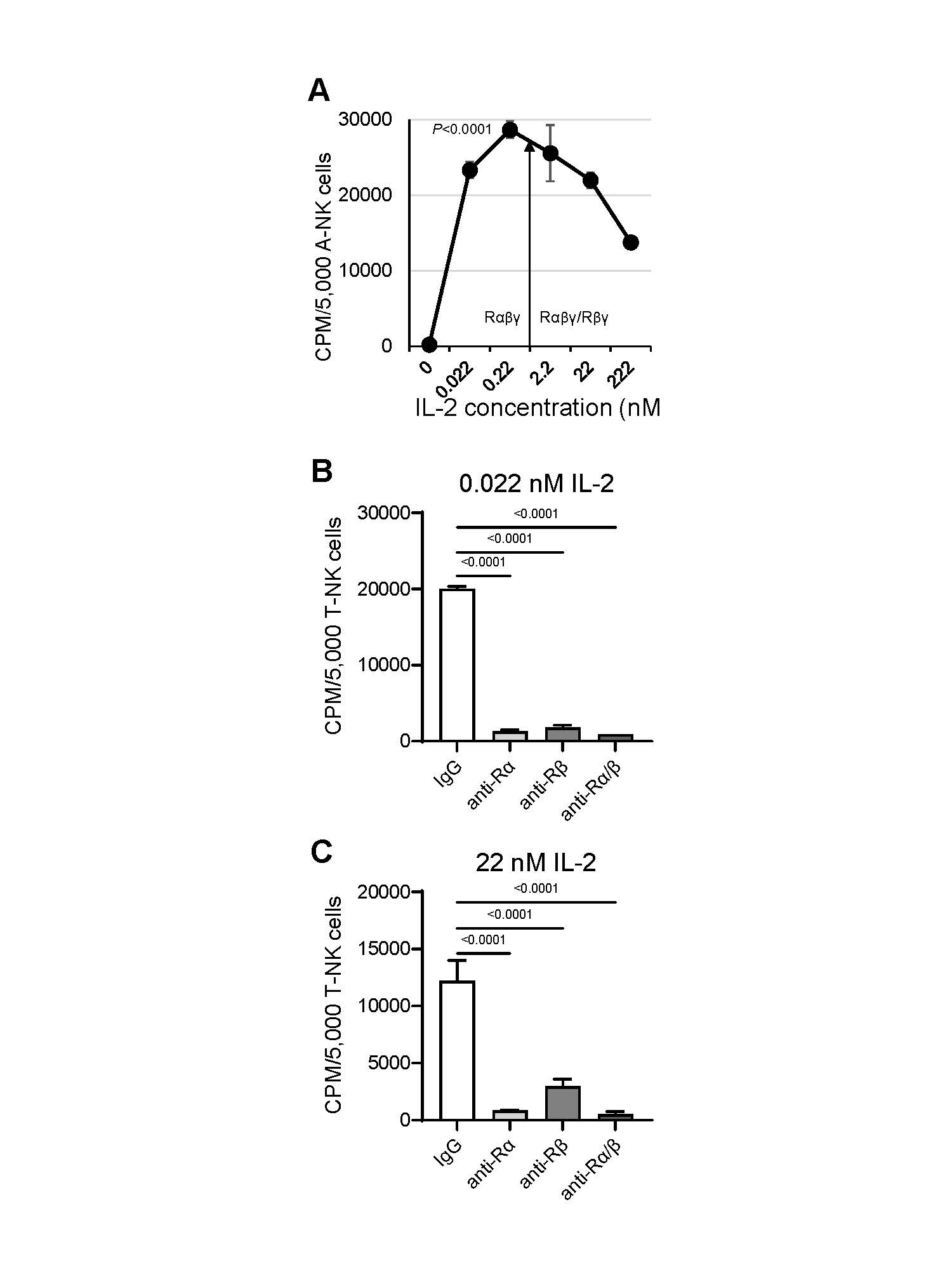 A-NK cells stimulated with 22 nM IL-2 for 10 or 14 days were harvested, washed, and re-cultured for 4 days in the presence 22 nM IL-2, and 20 μg/mL of isotype control IgG, anti-IL-2Rα and/or anti-IL-2Rβ monoclonal antibodies (mAbs). Following treatments, cells were assessed for proliferation using 4-h [3H]-thymidine incorporation assays.