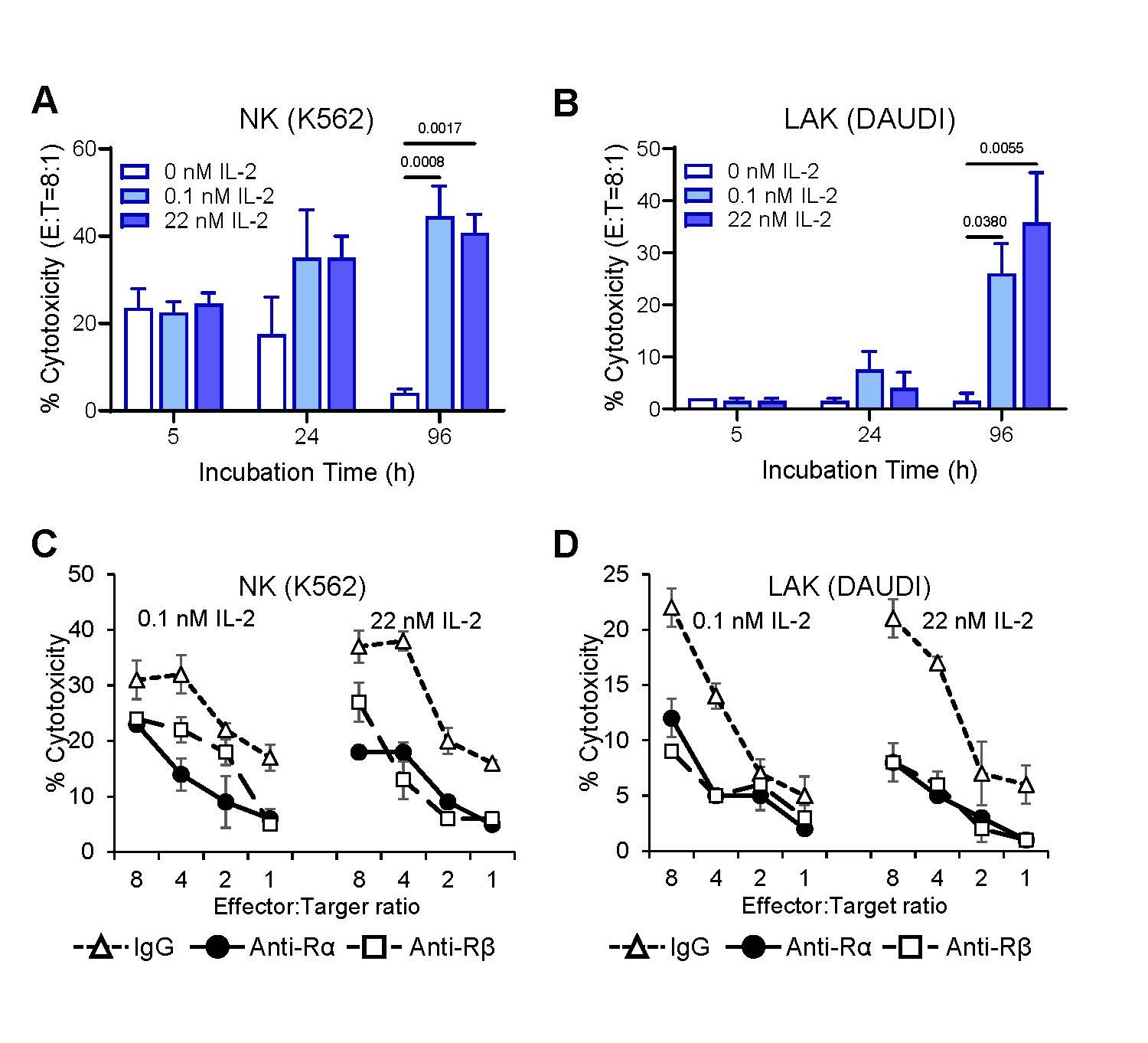 A-NK cells primed with 22 nM IL-2 were cultured for 4 to 5 days in the presence of 0.022, 0.1 or 22 nM IL-2 ± 20 μg/mL of isotype control IgG, anti-IL-2Rα and/or anti-IL-2Rβ mAbs. After treatments, cells were assessed for proliferation, and for cytotoxicity, using 4-h 51Cr release assays against K562 and Daudi target cells.