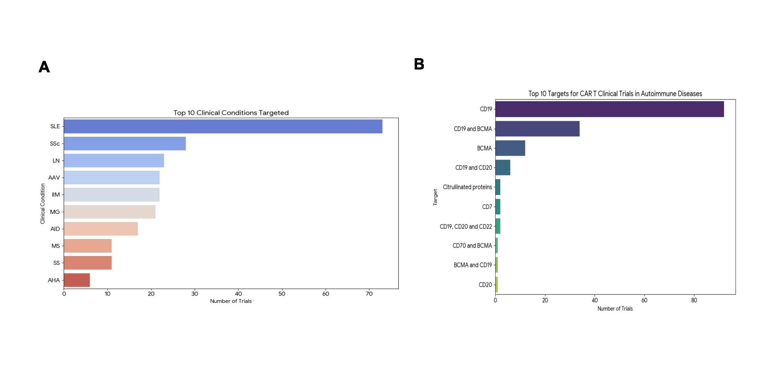 Figure 1. Clinical trials using traditional CAR T-cell therapy targeting B cells. A, A horizontal bar chart ranking autoimmune disorders by the number of active clinical trials. Systemic Lupus Erythematosus (SLE) represents the most frequently targeted condition, with significant activity also noted in Systemic Sclerosis (SSc), Lupus Nephritis (LN), and Myasthenia Gravis (MG). B, A bar chart illustrating the distribution of molecular targets utilized in current trials. CD19 is the most prevalent target, followed by dual-targeting strategies such as CD19 and BCMA. Other targets include BCMA alone and combinations involving CD20 and CD22. This figure was modified from Table 1 of reference #26.