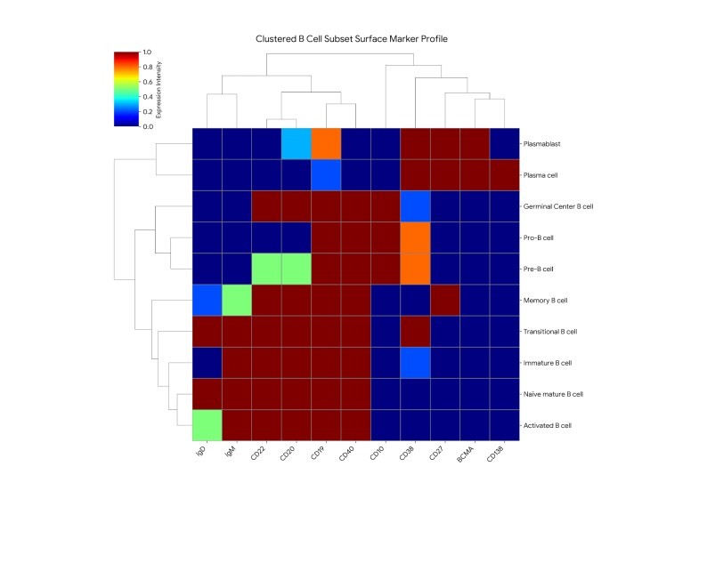 Figure 2. Cell surface markers expressed in B cell subsets. This heatmap illustrates the differential expression of key surface markers across various stages of B-cell development and maturation. The rows represent distinct B-cell subsets, including pro-B cells, pre-B cells, memory B cells, and plasma cells, while the columns display lineage-restricted markers such as CD19, CD20, CD22, and BCMA. The color gradient represents expression intensity, ranging from low/no expression (dark blue) to high expression (dark red).
