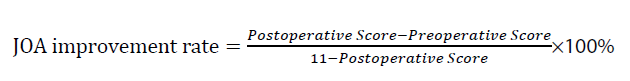 JOA score: Evaluates thoracic spinal cord function. This evaluation includes lower limb motor function (4 points), sensation (4 points), and bladder function (3 points), with a maximum score of 11. The JOA improvement rate is calculated as: