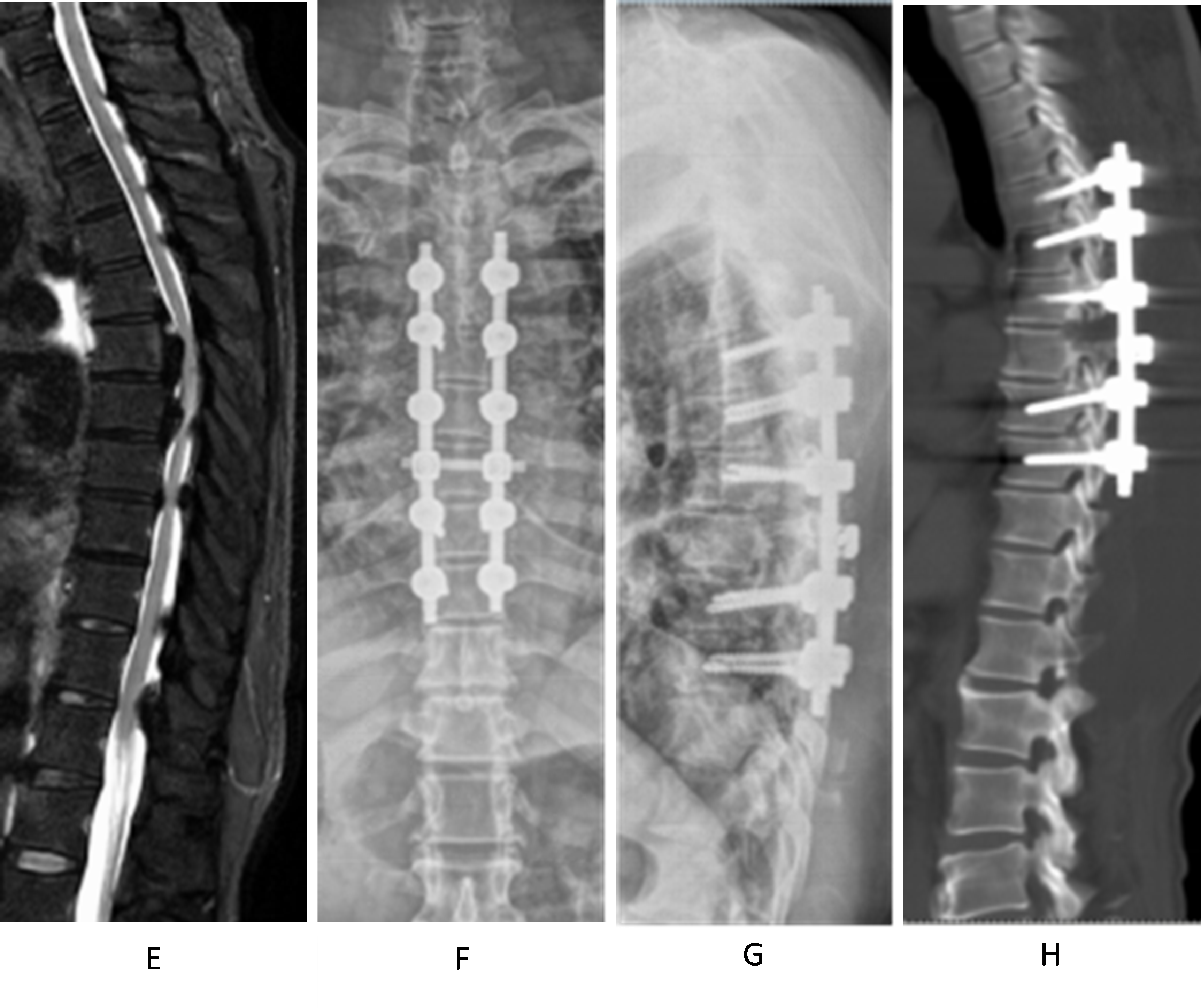 Figure 3 (E–H). E shows the preoperative thoracic MRI: Ossification of the posterior longitudinal ligament (PLL) of T5–7 and ossification of the ligamentum flavum of T4–7 can be seen together with anterior and posterior compression of the segmental spinal cord. F and G show the postoperative thoracic X-ray: T3–8 pedicle pins were well positioned; H shows the postoperative thoracic CT sagittal view: T4–7 laminectomy was performed, and T5–6 PLL ossification was cut off to de-convex the kyphosis. Both facet joints were partially removed. The preoperative and postoperative Cobb's angles were 30° and 15°, respectively.