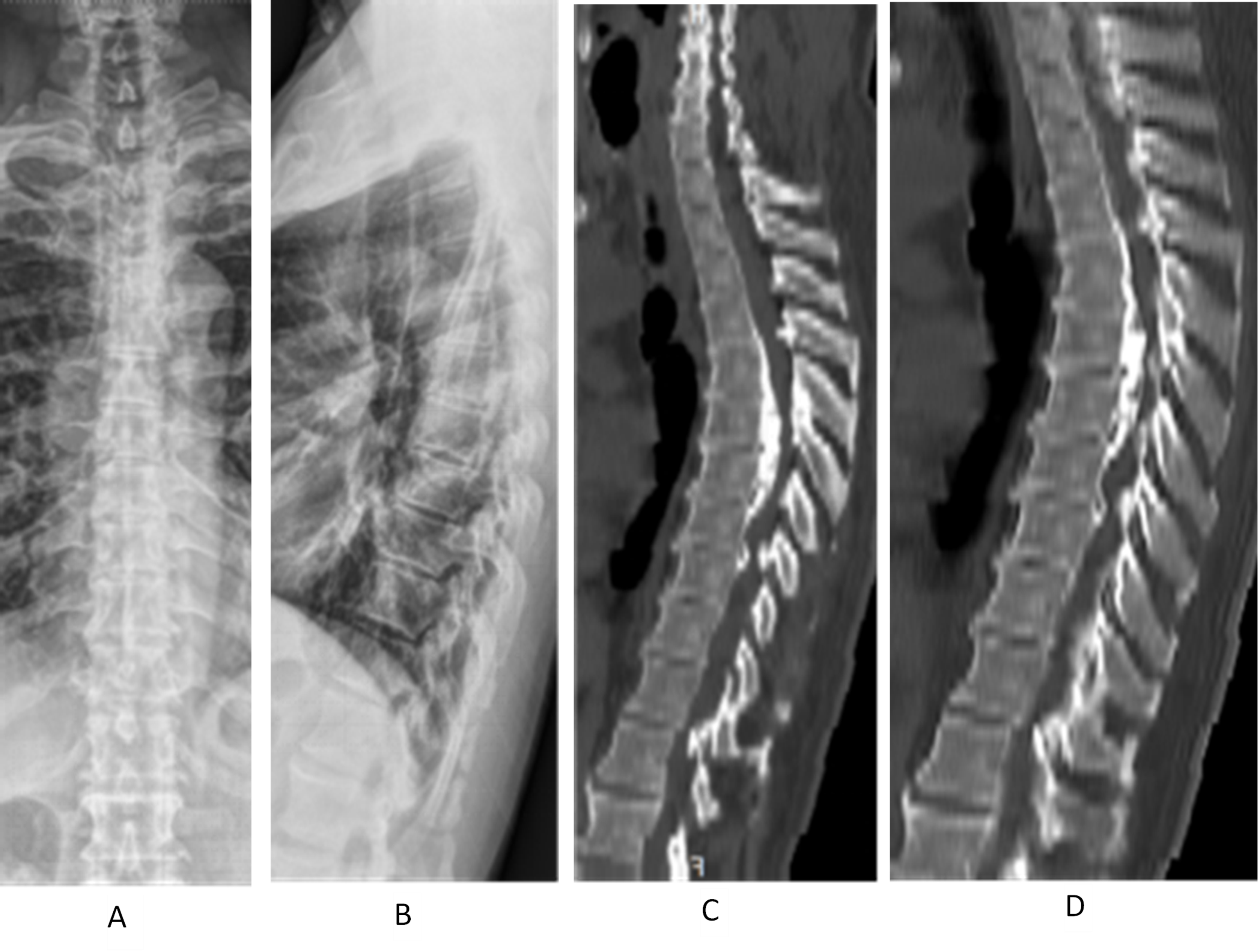 Figure 3 (A–D). Demonstrates a case of a male, 57 years old, thoracic posterior longitudinal ligament (PLL) ossification (continuous type), laminectomy, PLL ossification block cutting with ultrasonic bone knife system, and de-posteriorization orthopedic internal fixation. A and B show the frontal and lateral view of preoperative thoracic spine X-ray; C and D show the preoperative thoracic spine CT sagittal radiograph. T4–7 have continuous PLL ossification, protruding into the spinal canal. The stenosis segment has 37° of Cobb angle with posterior convexity.