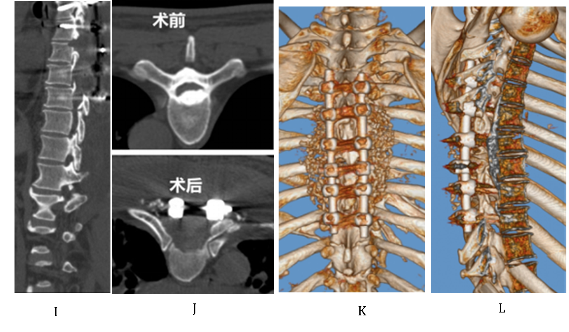 Figure 3 (I–L). I shows the postoperative thoracic spine CT sagittal view, demonstrating laminectomy of T4–7, resection of the ossified posterior longitudinal ligament (OPLL) at T5–6, and correction of kyphosis with a Cobb angle of 15° in the stenotic segment; J Comparison of preoperative (upper) and postoperative (lower) thoracic spine CT transverse views. Upper figure shows the OPLL within the spinal canal; lower figure shows the resection of the OPLL and circumferential decompression. K and L show the three-dimensional reconstruction images of thoracic spine CT at the final follow-up, demonstrating posterolateral spinal fusion and the condition within the spinal canal.