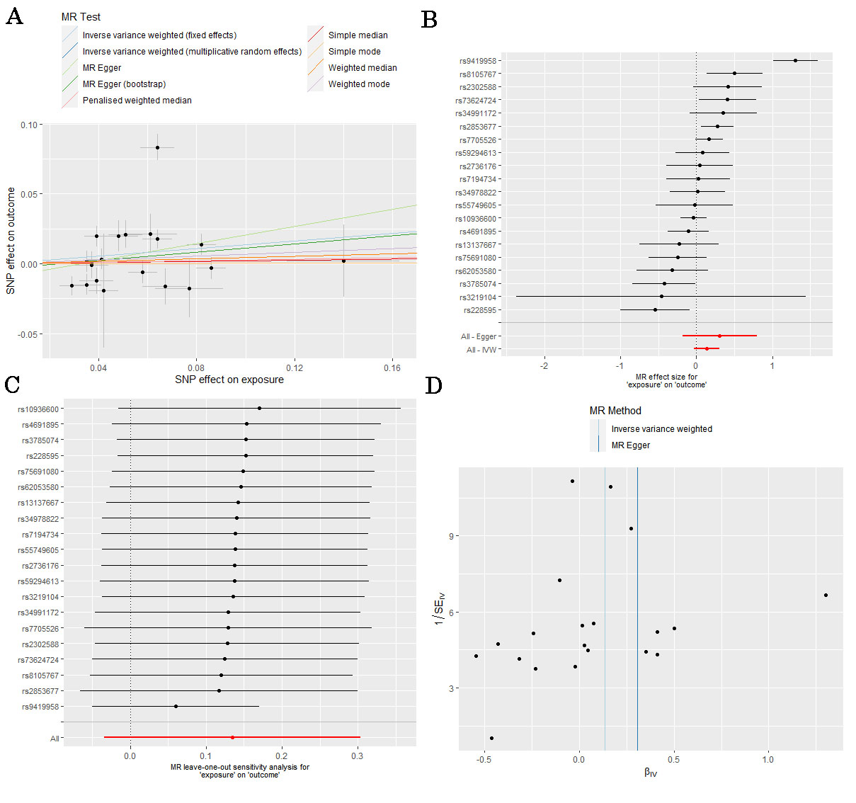 The MR analysis in the fixed-effect inverse-variance weighted models and MR Egger (bootstrap) method showed that LTL was associated with an increased risk of AF (odds ratio [OR], 1.145; 95% CI, 1.065-1.230, P<0.001; OR, 1.158; 95% CI, 1.007-1.331, P=0.021) based on 20 SNPs as the instrument variables, as shown in Figure 1B. However, the opposite results were observed in the method of simple mode (OR, 1.002; 95% CI, 0.802-1.253, P=0.986), weighted mode (OR, 1.069; 95% CI, 0.929-1.229, P=0.365), simple median (OR, 1.019; 95% CI, 0.892-1.165, P=0.777), weighted median (OR, 1.046; 95% CI, 0.932-1.173, P=0.448), Penalised weighted median (OR, 1.026; 95% CI, 0.910-1.158, P=0.671), MR-Egger method (OR, 1.360; 95% CI, 0.835-2.215, P=0.233), and random-effect inverse-variance weighted models (OR, 1.145; 95% CI, 0.967-1.355, P=0.117), as shown in Table 2. Therefore, we did not believe that there is a significant causal relationship between LTL and AF. The leave-one-out sensitivity analysis showed that the association between LTL and AF was not substantially driven by any individual SNP (Figure 1C). Asymmetry in the funnel plot indicates directional horizontal pleiotropy, which can bias MR methods; however, the funnel plot and MR Egger regression test showed no evidence of asymmetry (Figure 1D).