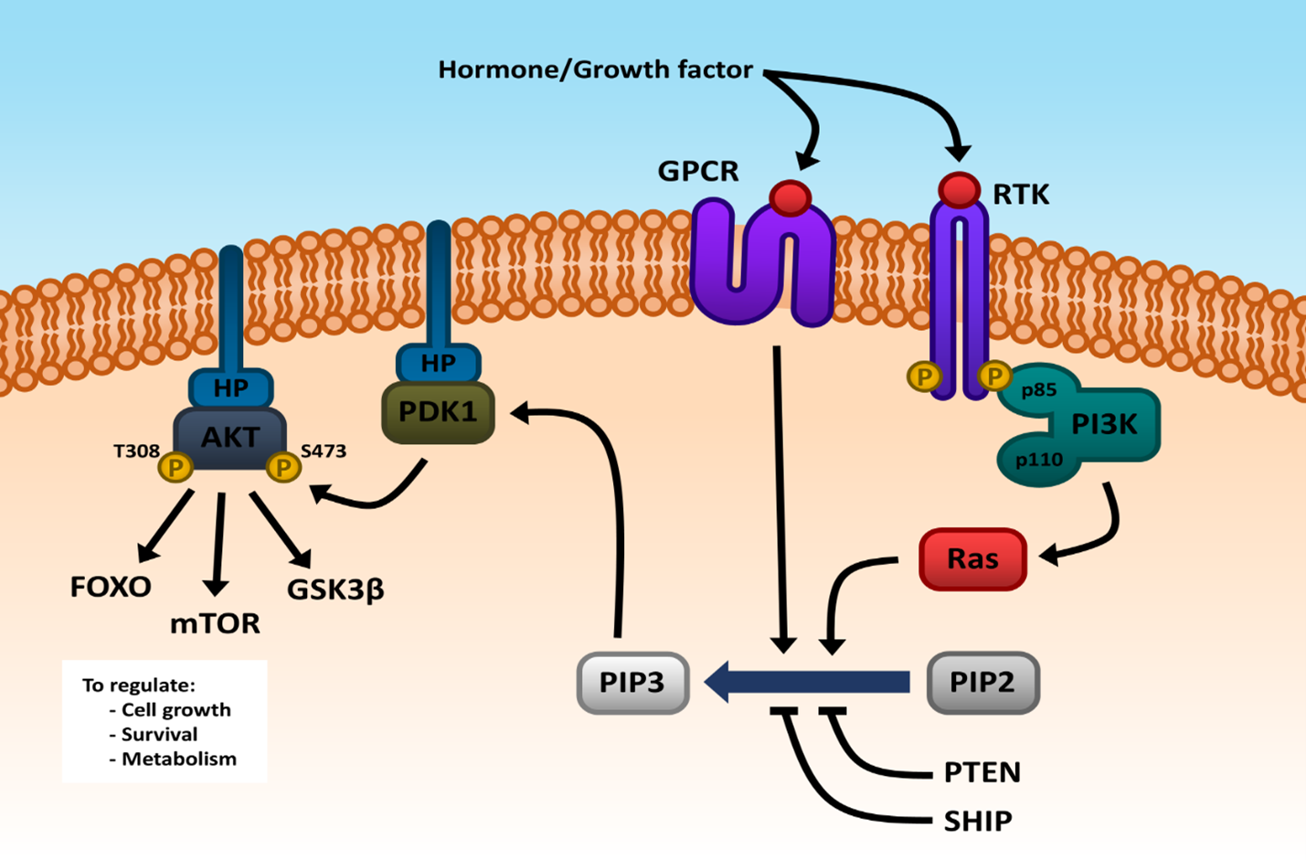Phosphoinositide 3-kinases (PI3K) are a family of signal transducers and intracellular enzymes crucial for many cellular processes [2]. In mammalian cells, there are eight PI3Ks that are categorized into three classes (Class I, Class II, and Class III) based on their substrate specificity, structure, and regulation. PI3Ks phosphorylate inositol phospholipids at the 3-position on the inositol ring, producing vital signaling molecules like phosphatidylinositol-3,4,5-trisphosphate (PIP3), phosphatidylinositol-3,4-bisphosphate (PIP2), and phosphatidylinositol-3-phosphate (PIP) [4]. These signaling molecules regulate various cellular functions, including cell growth, apoptosis, autophagy, synaptic plasticity, and signal transduction [24]. Class I PI3Ks, are heterodimers consisting of a catalytic subunit (p110) and a regulatory subunit (p85). The p85 subunit's SH2 domain binds to phosphorylated tyrosines in the cytoplasmic domain of RTKs, which are located in the plasma membrane. Upon activation by extracellular signals such as hormones or growth factors, these receptors activate Ras, a protein that subsequently activates PI3K. PI3K then catalyzes the conversion of phosphatidylinositol 4,5-bisphosphate (PIP2) into phosphatidylinositol 3,4,5-trisphosphate (PIP3), which acts as a docking site for the serine/threonine kinase Akt (Protein Kinase B) [25]. Akt becomes activated following phosphorylation at specific sites (T308 and S473) and then phosphorylates numerous downstream target proteins, influencing various cellular responses. Class II PI3Ks are high-molecular-weight monomers, including three types: PI3K-C2α, PI3K-C2β, and PI3K-C2γ. Class III PI3Ks, known as vacuolar protein sorting 34 (Vps34), are distinct from the other classes and are involved in different cellular processes [26].