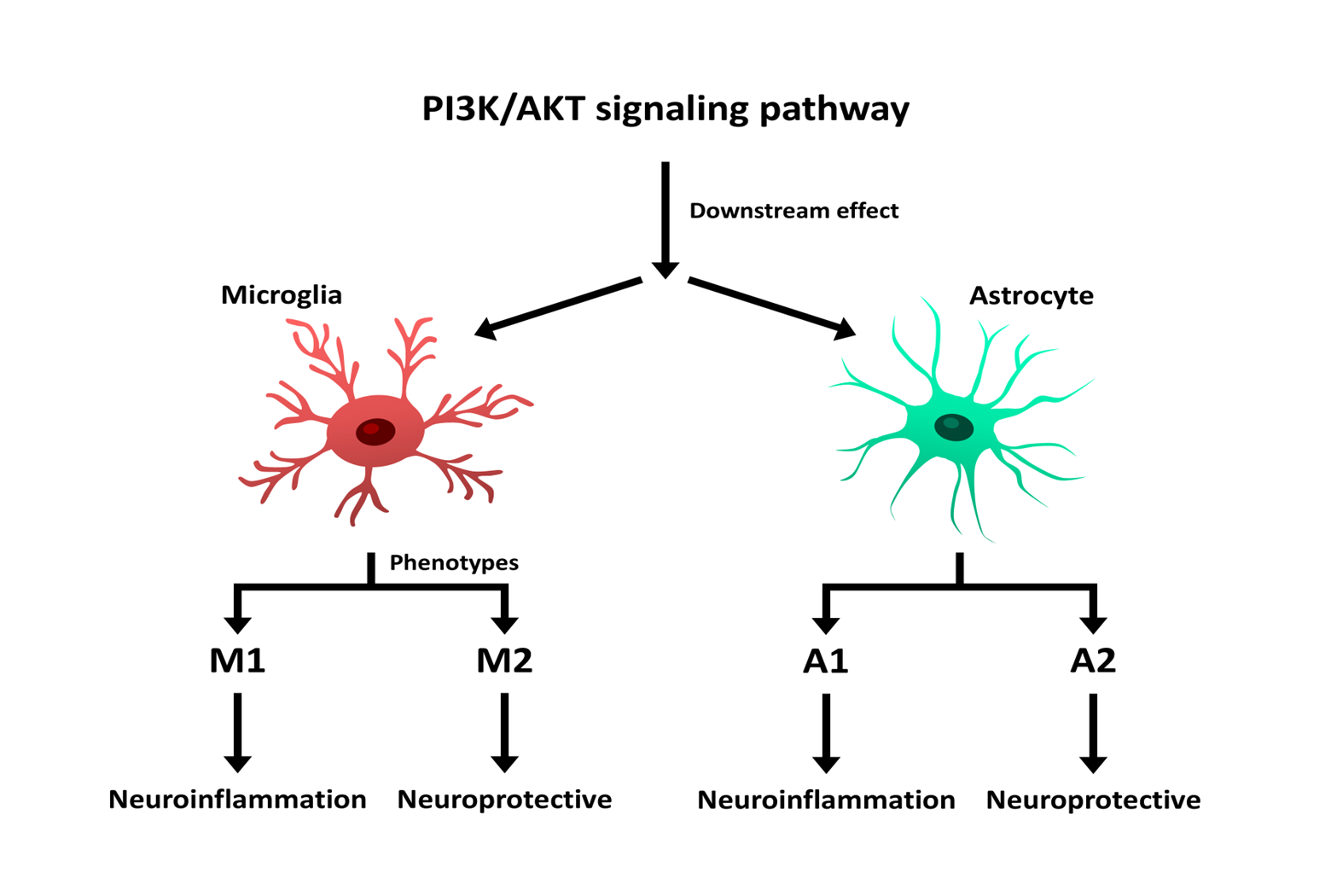 As a result, The PI3K/AKT signaling pathway is a key regulator of astrocyte function. Activation of this pathway promotes the A2 phenotype, enhancing neuroprotection by reducing inflammatory responses and supporting neuronal repair. Conversely, reduced PI3K/AKT activity biases astrocytes toward the A1 phenotype, amplifying neurotoxicity and inflammation.