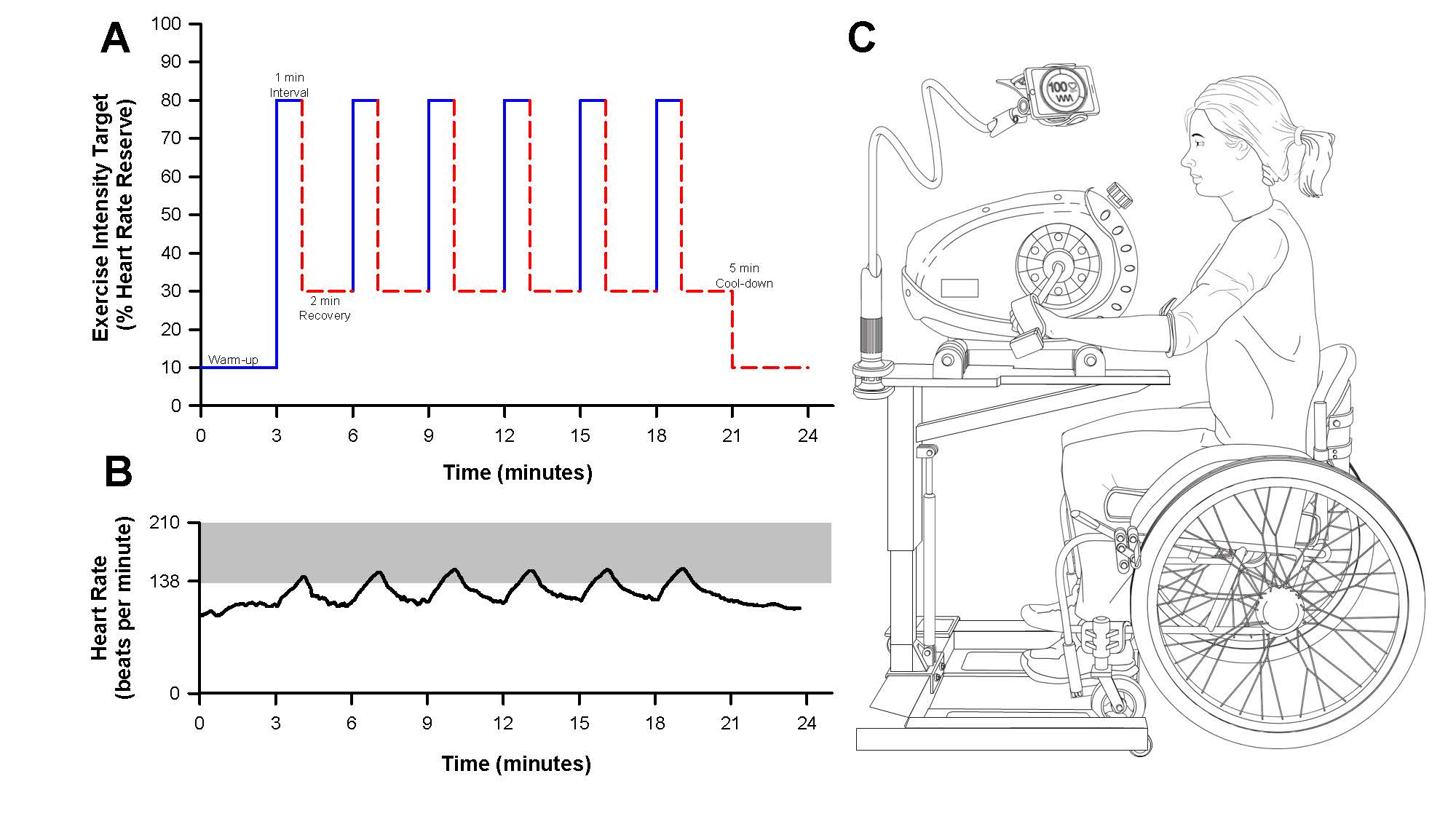 High-intensity interval training (HIIT) is a method of exercise where individuals engage in repeated intervals of intense activity, each followed by a brief period of recovery. HIIT has previously demonstrated substantial improvements in cardiometabolic health in the able-bodied population [9–11]. Additionally, HIIT may shorten the duration of activity required to elicit similar cardiometabolic outcomes compared to continuous, moderate-intensity aerobic exercise [12,13]. Shortening the activity duration may mitigate repeated-use injuries in the upper extremities for individuals with SCI and improve adherence to a prescribed exercise routine. For these reasons, HIIT serves as a promising exercise intervention to improve cardiometabolic health among individuals with SCI.