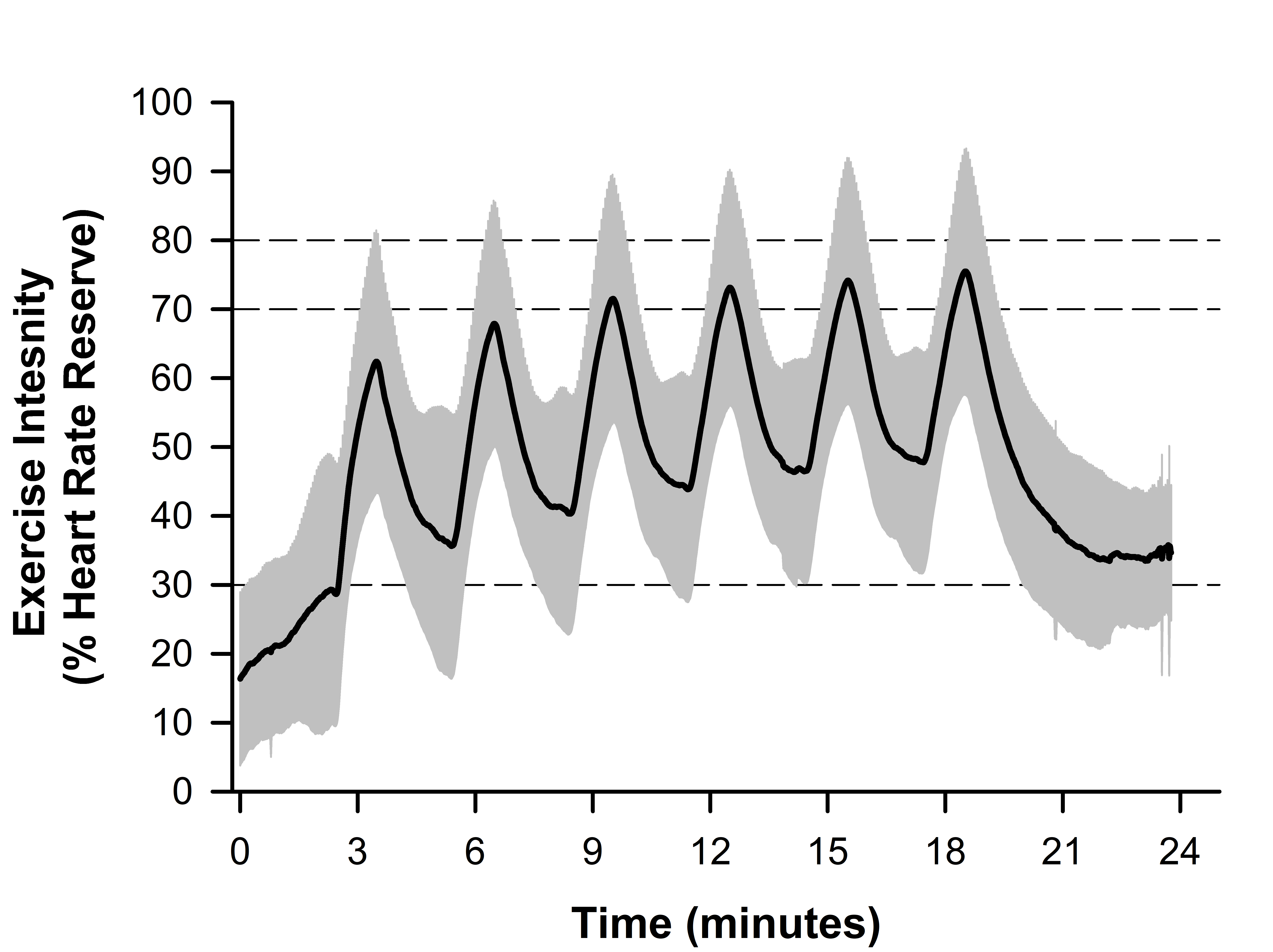 Figure 3. Line plot depicting the composite high-intensity interval training (HIIT) session data for all participants across all attempted workouts (n=338). Data is normalized to the percent of heart rate reserve (HRR). The solid black line depicts the average heart rate, and the grey bands depict the standard deviation. Dashed lines at 70 and 80% HRR represent acceptable and target HRR for each interval, respectively, and the dashed line at 30% HRR represents the recovery target.