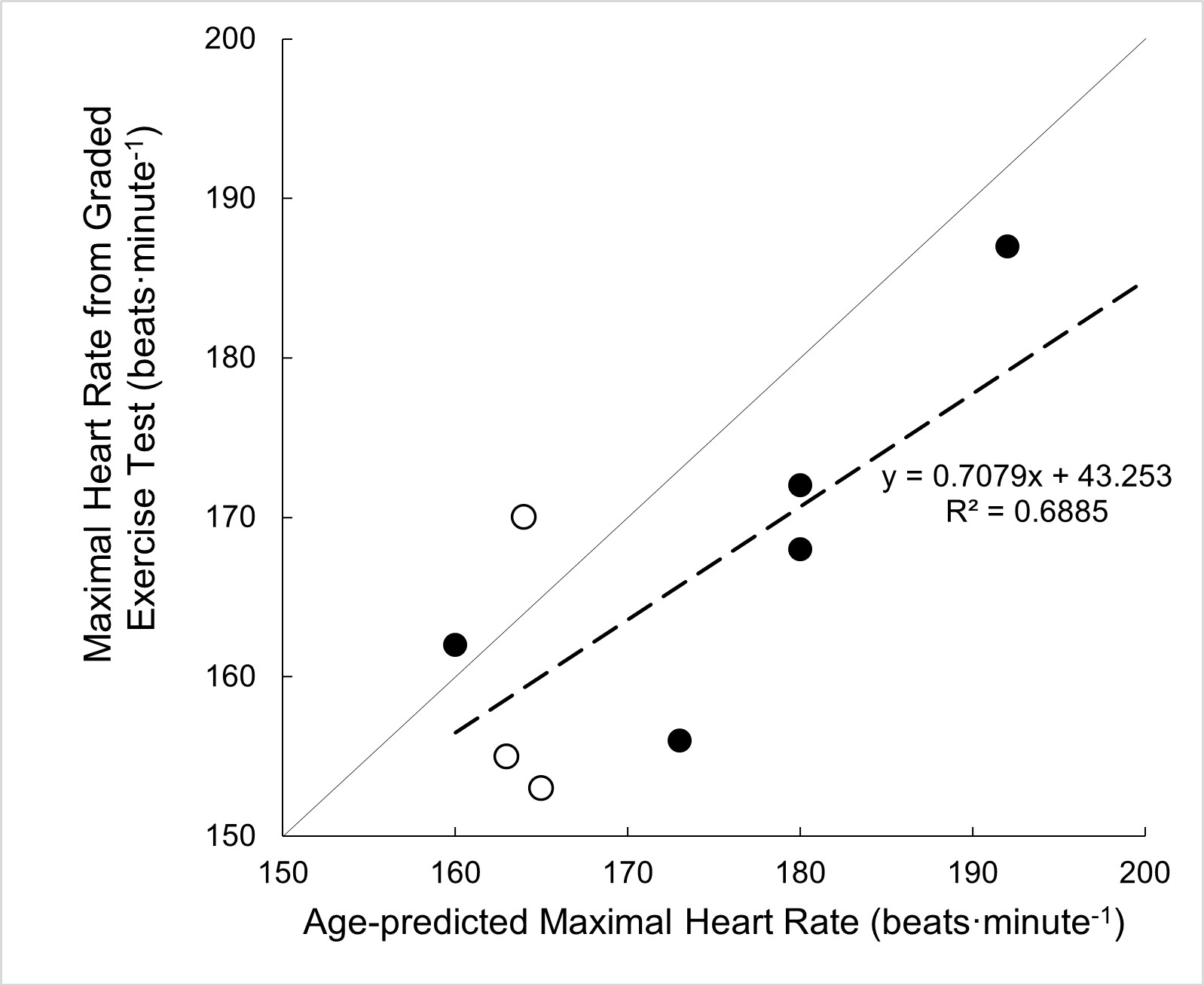 Figure 4. Scatter plot depicting the comparison of age-predicted maximal heart rate versus the measured maximal heart rate during a graded exercise test using arm ergometry. The solid line represents the line of identity and dashed line represents line of best fit. Solid symbols indicate male data and open symbols indicate female data.