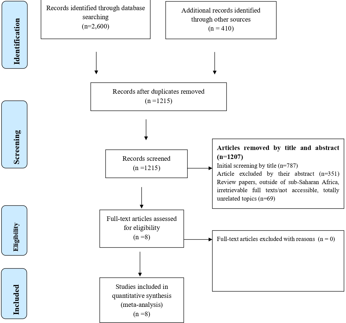 A total of 3,100 studies were identified; 2,600 Records identified through different database searching and 410 from other sources. After duplication removed, a total of 1,215 articles remained (1,885 removed by duplication). We further excluded 787 studies because they were not relevant up-on reviewing the titles. Then the full-text of the remaining 428 articles was downloaded and fully assessed for fulfilling the required criteria. We again excluded 351 articles by their abstract and Review papers, outside of sub-Saharan Africa, irretrievable full texts/not accessible, totally unrelated topics (n=69). Finally, 8 full-text studies were reviewed, and all of the articles met the inclusion criteria selected for this systematic review and meta-analysis with total 2,611enrolled participants and 405 Significant bacteriuria were detected (Figure 1). Figure 1 summarizes the process of identification, screening, checking for eligibility and inclusion into the final analysis.