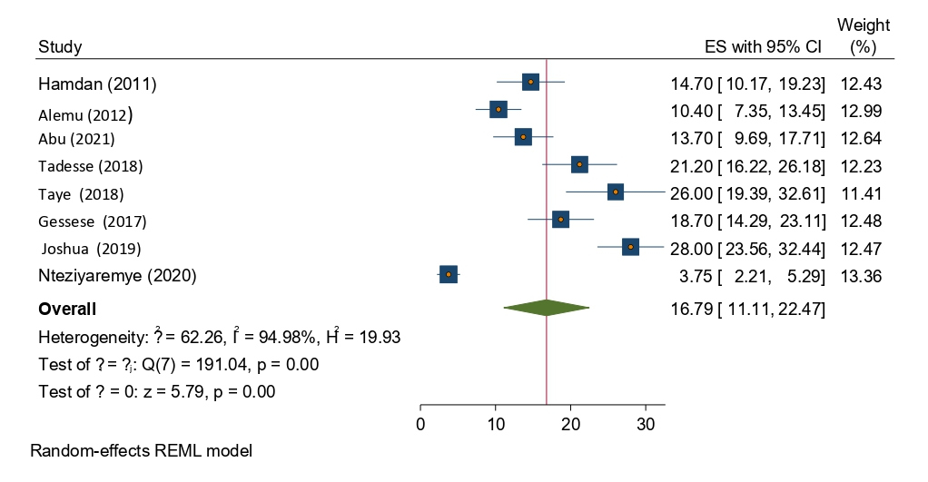From the total of (n=8) studies reported, the prevalence of significant bacteriuria among pregnant women in Eastern Africa. The prevalence of significant bacteriuria was ranged from 3.75% to 28%. The random-effects model analysis from those studies revealed that, the pooled prevalence of significant bacteriuria among pregnant women attending antenatal care in Eastern Africa was found to be 16.79% (95% CI; 11.11–22.47; I2=94.98%; p<0.001) (Figure 2).