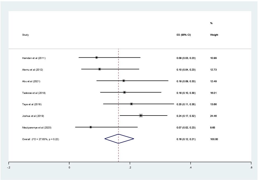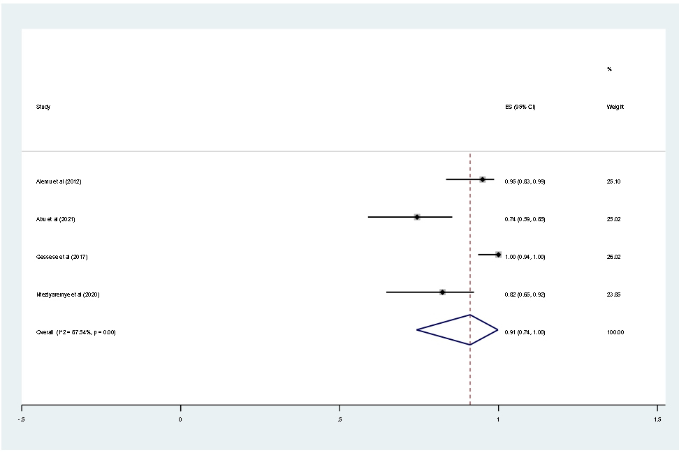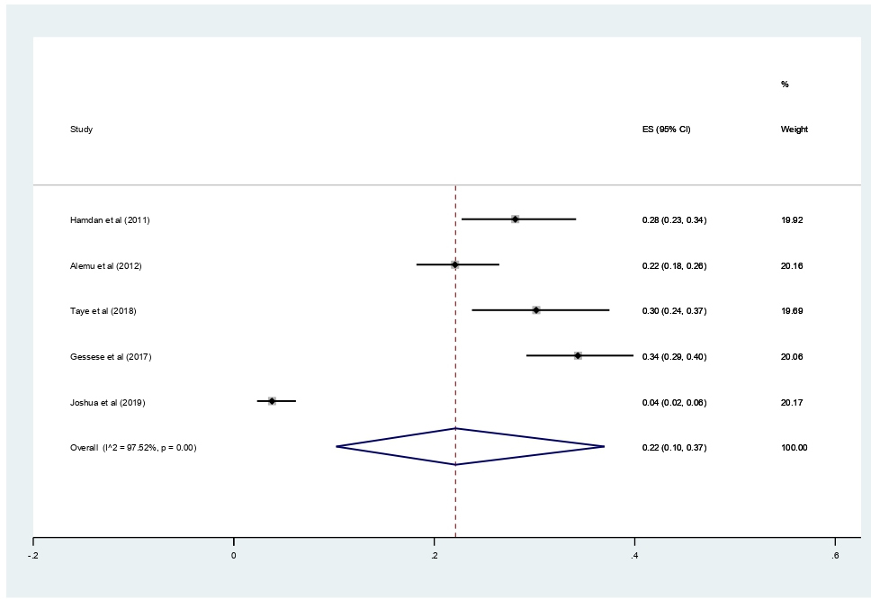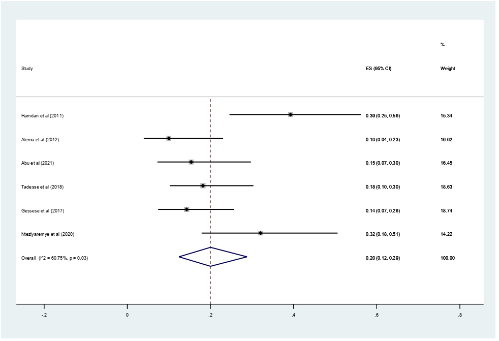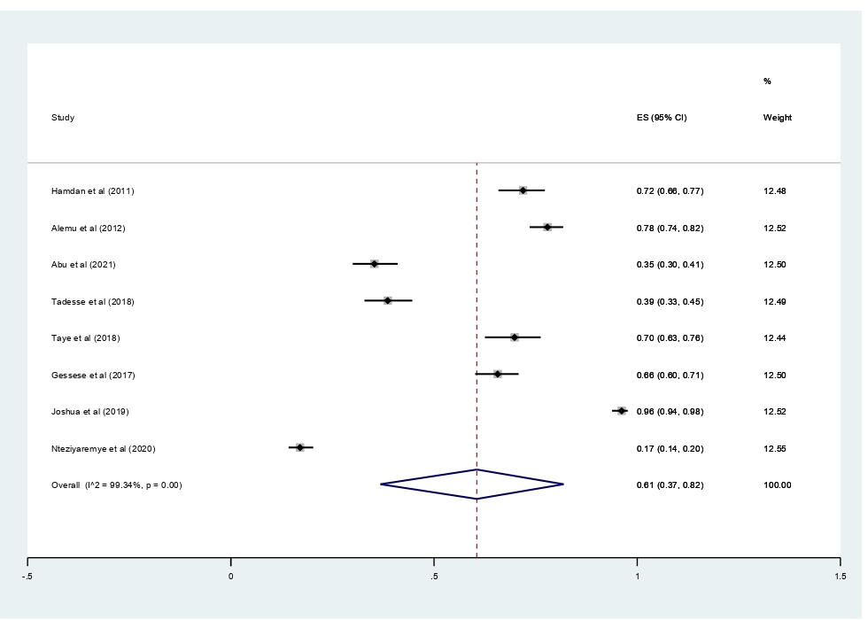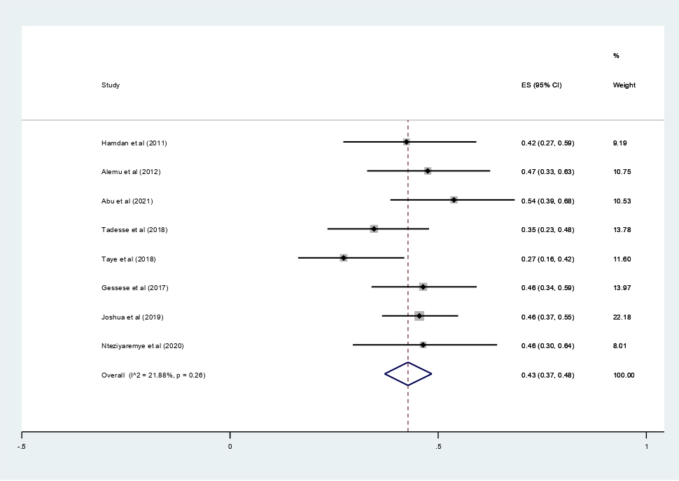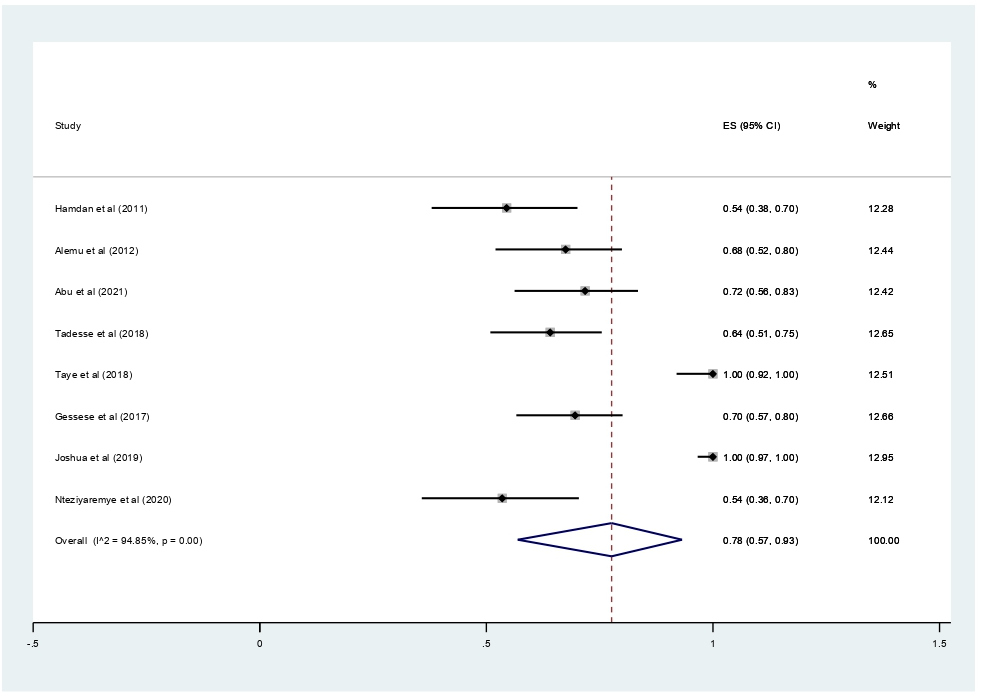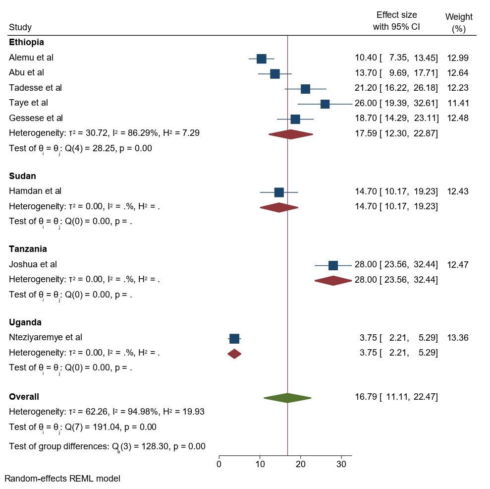 The main strength of this meta-analysis is that it was the first to be reported from East Africa. The authors used a pre-specified protocol for search strategy, data abstraction, and quality assessment. The included studies were low risk of bias based on JBI quality assessment checklist. Moreover, we employed subgroup analysis based on study country and year of publication and sensitivity analysis to identify the small study effect and the risk of heterogeneity. In this meta-analysis, there is also significant publication bias, which is graphically assessed using funnel plots and statistically checked for the presence of a small study effect using the Egger test, affecting the interpretation of the findings. Furthermore, the reader should be aware that the protocol for this study was made public and registered on Prospero (with registration number:--), which could lead to avoid bias.