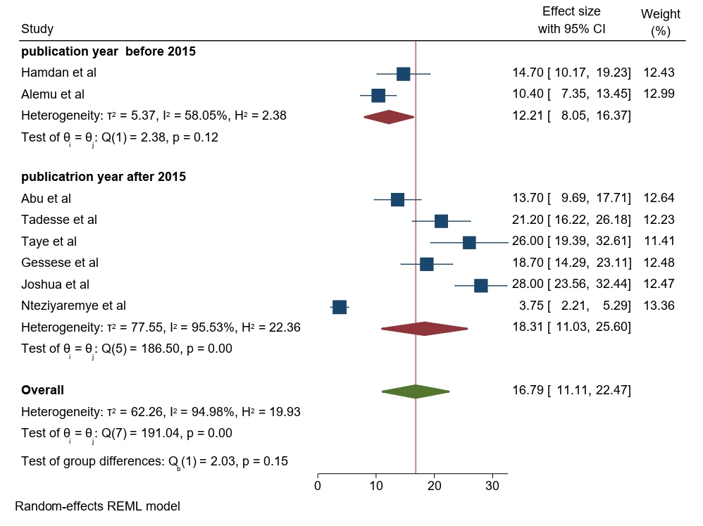 Based on the year of publication, the prevalence of significant bacteriuria among pregnant women was 12.21% (95% CI: 8.05–16.37) in studies published before 2015 and 18.31% (95% CI: 11.03–25.60) in studies published after 2015 (Figure 7).