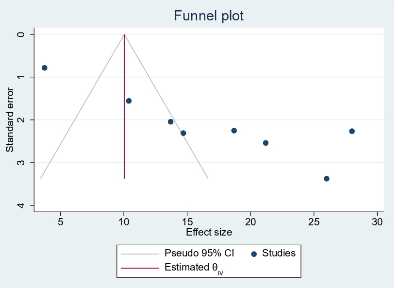 Figure 14. Funnel plot showing publication bias among pregnant women in East Africa, 2024.