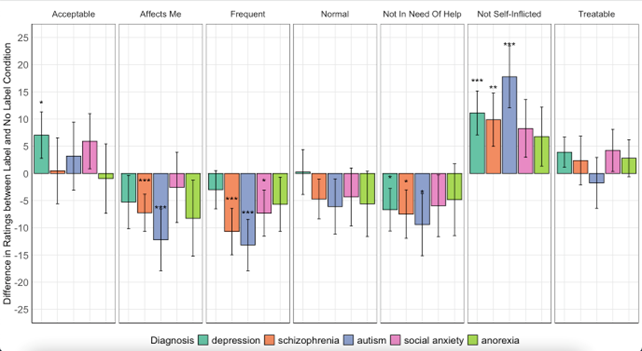 Figure 1. Labeling Effects by Diagnosis and Rating Category. Note. Mean differences in absolute ratings between the label and no label conditions across different diagnoses. Since ratings can range from 0-100, differences can accordingly range from -100 to +100. Positive values indicate higher ratings of labeled versus unlabeled symptoms in the direction of the attribute specified at the top. Error bars show 95% confidence intervals. Asterisks denote p-values after applying Bonferroni corrections for multiple testing, i.e.: *p<.05 / 35, **p<.01 / 35, ***p<.001 / 35.