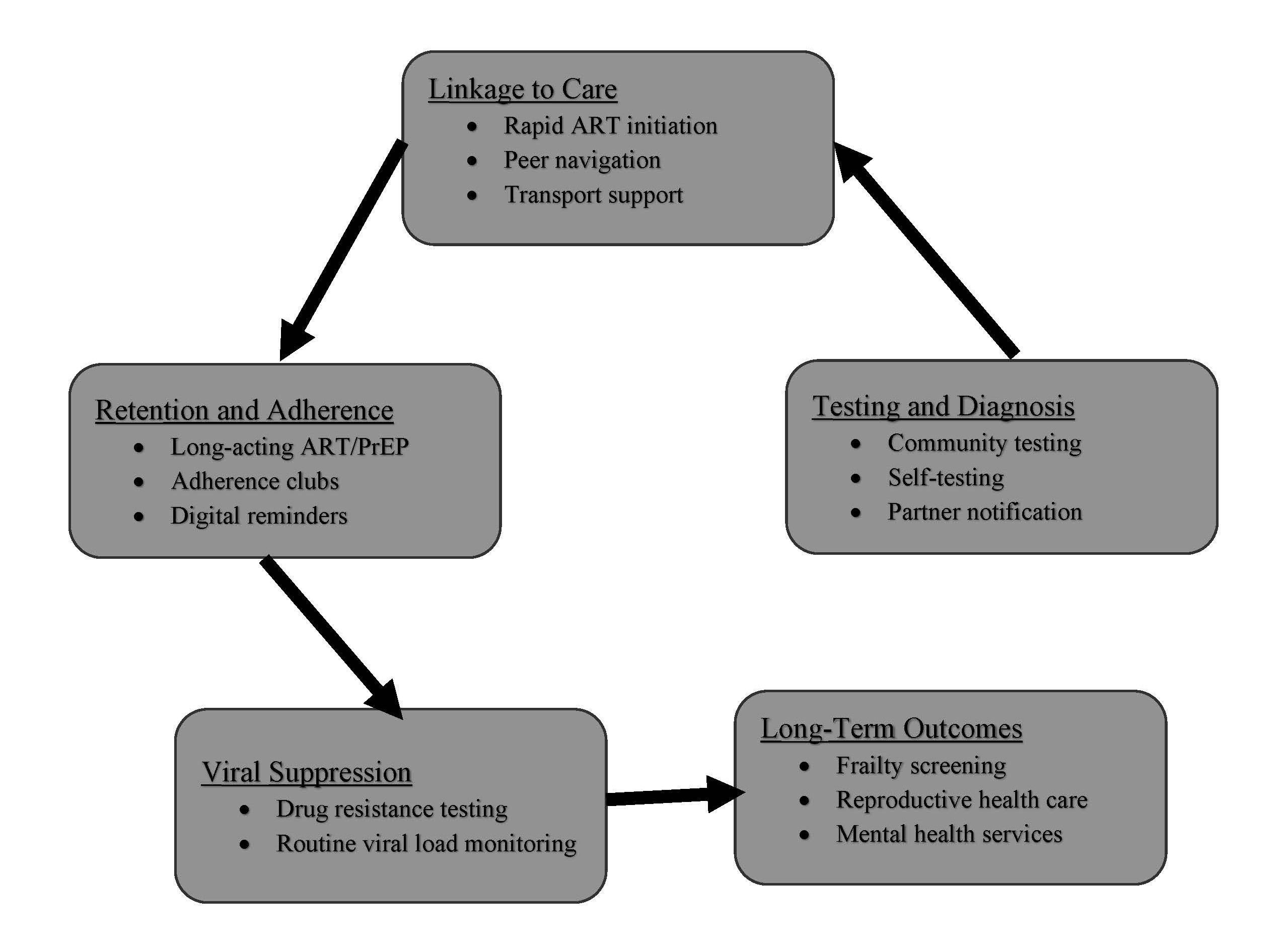 With some of these challenges, a new frontier in HIV therapeutics and prevention has emerged, with promising innovations such as long-acting injectable ART and broadly neutralizing antibodies (bNAbs), intravaginal rings for women and dermal implants, as well as curative gene-editing strategies redefining the landscape of viral control and remission (Table 3). Long-acting regimens like cabotegravir-rilpivirine offer the potential to improve adherence and reduce stigma, yet their high cost and cold-chain requirements limit scalability in low- and middle-income countries (LMICs) [60,61]. Clinical trials, such as the First Long-Acting Injectable Regimen (FLAIR) and Antiretroviral Therapy as Long Acting Suppression (ATLAS) studies, demonstrated that this regimen was non-inferior to daily oral ART in maintaining viral suppression among treatment-experienced adults [62,63]. It is exciting that these long-acting agents are also being explored for prevention, with cabotegravir being the first agent approved for PrEP [64]. Another long acting injectable, lenacapavir, a capsid inhibitor, injected subcutaneously every 6 months for people with extensive HIV drug resistance has just been approved for PrEP as of June 2025 requiring injections only twice in the year [65,66]. Lenacapavir received FDA approval in June 2025 for PrEP in at-risk adults and adolescents weighing ≥35 kg [67]. PURPOSE 1 [68] and PURPOSE 2 [66] randomized controlled trials reported that Lenacapavir was superior to daily oral PrEP, with efficacy rates of 100% among cis-gender women and 96% among men and gender-diverse individuals. As these therapeutic innovations accelerate, the biggest concern is cost and accessibility to the populations that need them the most. Access barriers persist, especially in low- and middle-income countries, underscoring the importance of licensing and pricing strategies to ensure global equity. Voluntary licensing and volume guarantee my improve affordability and distribution in low-income countries. Hence, it beckons the important and urgent need for the world health organization, governments, pharmaceuticals, donors and other stake holders to coordinate how to ensure global, ethical and equitable access, prevent disparities, and implement delivery models to accommodate diverse populations, including pregnant women and older adults, gender and racial minorities and LMIC populations. Figure 1 maps key interventions across the HIV care cascade, emphasizing where programs can intervene to improve testing, linkage, retention, and long-term outcomes.