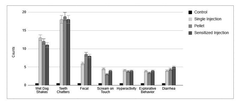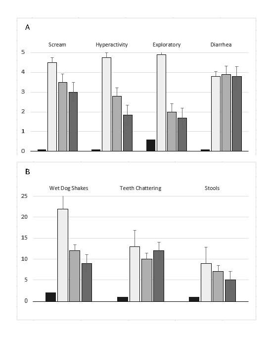 Four groups of male Sprague Dawley rats (N = 8 per group), each weighing approximately 200 g, were randomly assigned to one of four experimental groups: Group 1 – Control: Implanted with a placebo pellet. After 72 hours, the pellet was removed and rats received 1.0 mg/kg naloxone and behavioral assessment of withdrawal were performed. No withdrawal behaviors were observed (Figure 2). Group 2 – Morphine Control: Implanted with a morphine pellet for 72 hours. Following pellet removal, saline was administered and two hours later, 1.0 mg/kg naloxone was injected, and behavioral assessment of withdrawal were performed (Figure 2). Group 3 – Pre-Treatment Cortisol: Administered 2.0 mg/kg cortisol two hours prior to morphine pellet implantation. After 72 hours, the pellet was removed, and two hours later, 1.0 mg/kg naloxone was injected, and behavioral assessment of withdrawal were performed (Figure 2). Group 4 – Post-Treatment Cortisol: Implanted with a morphine pellet for 72 hours. After pellet removal, 2.0 mg/kg cortisol was administered, followed by 1.0 mg/kg naloxone and two hours later, behavioral assessment of withdrawal was performed (Figure 2). This design enabled evaluation of cortisol’s modulatory effects on preventing and treating morphine withdrawal symptoms. Seven behavioral withdrawal signs were assessed by two independent observers and scored from 0 (no difference from control) to 5 (maximum intensity). These behaviors, shown in Figure 2A, included the following behavioral expression 1. Scream to touch, 2. Hyperactivity, 3. Exploratory behavior, and 4. Diarrhea. Figure 2B presents three additional behavioral expressions: 5. Wet dog shakes, 6. Teeth chattering, and 7. Number of stools within 10 minutes post-naloxone administration respectfully. These assessments followed established protocols [13,14].