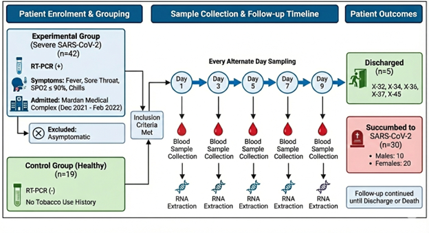 Figure 1. Schematic illustration of the follow-up process for patients who met the inclusion criteria. The study involved an experimental group of 42 patients admitted to Mardan Medical Complex (December 2021–February 2022) with confirmed severe SARS-CoV-2 infection (RT-PCR positive) and associated symptoms. A control group consisting of 19 healthy, SARS-CoV-2 negative individuals with no history of tobacco use was also established. A subset of eighteen patients underwent longitudinal monitoring, where blood samples were collected and RNA was extracted starting on Day 1 and continuing every alternate day (Days 3, 5, 7, and 9).
