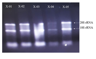 The samples received were thawed properly and mixed with 200 μL chloroform and vortexed for 30 seconds. Then, this mixture was incubated at -20°C for 3 minutes and centrifuged at 12,000 rcf for 10 minutes at 4°C. Aqueous phase was meticulously transferred to new microcentrifuge tube and 500 μL of isopropanol was added. This mixture was inverted several times and then incubated at -20°C for 10 minutes. Afterwards, this mixture was centrifuged at 12,000 rcf for 10 minutes at 4°C. Supernatant was discarded and pellet was washed with 1 mL 75% ethanol. Centrifuge was performed at 12,000 rcf for 2 minutes at 4°C. Supernatant was discarded and final RNA pellet was dried in sterile conditions at 4°C for 10 minutes before final suspension in nuclease free water. Presence of RNA was confirmed first using Berthold Detection Systems GmbH, Pforzheim (A 260/280 ratio of nearly 1.8 to 2 indicated RNA purity) and then denaturing gel electrophoresis performed at 90 V, 90 mA for 50 minutes (Figure 2).