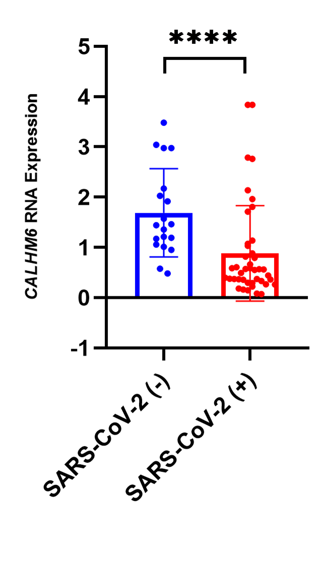 CALHM6 expression was assessed via qRT-PCR in SARS-CoV-2-positive (n=42) and SARS-CoV-2-negative patients (n=19). The analysis revealed a significant downregulation of CALHM6 in SARS-CoV-2-positive patients (p<0.0001****, Mann Whitney Test) compared to the control group (Figure 3). These findings indicate a notable reduction in CALHM6 expression among infected individuals.
