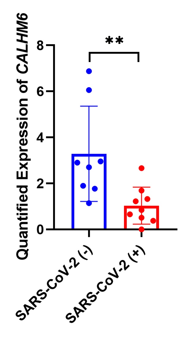 CALHM6 expression was assessed via ELISA in SARS-CoV-2 (+) patients (n=8) and SARS-CoV-2-negative patients (n=8). The analysis revealed a significant downregulation of CALHM6 in SARS-CoV-2-positive patients (p=0.0047**, Mann Whitney Test) compared to the control group (Figure 4) in line with qRT PCR findings. This confirms the in vivo reduction of both CALHM6 mRNA and protein expression following infection.