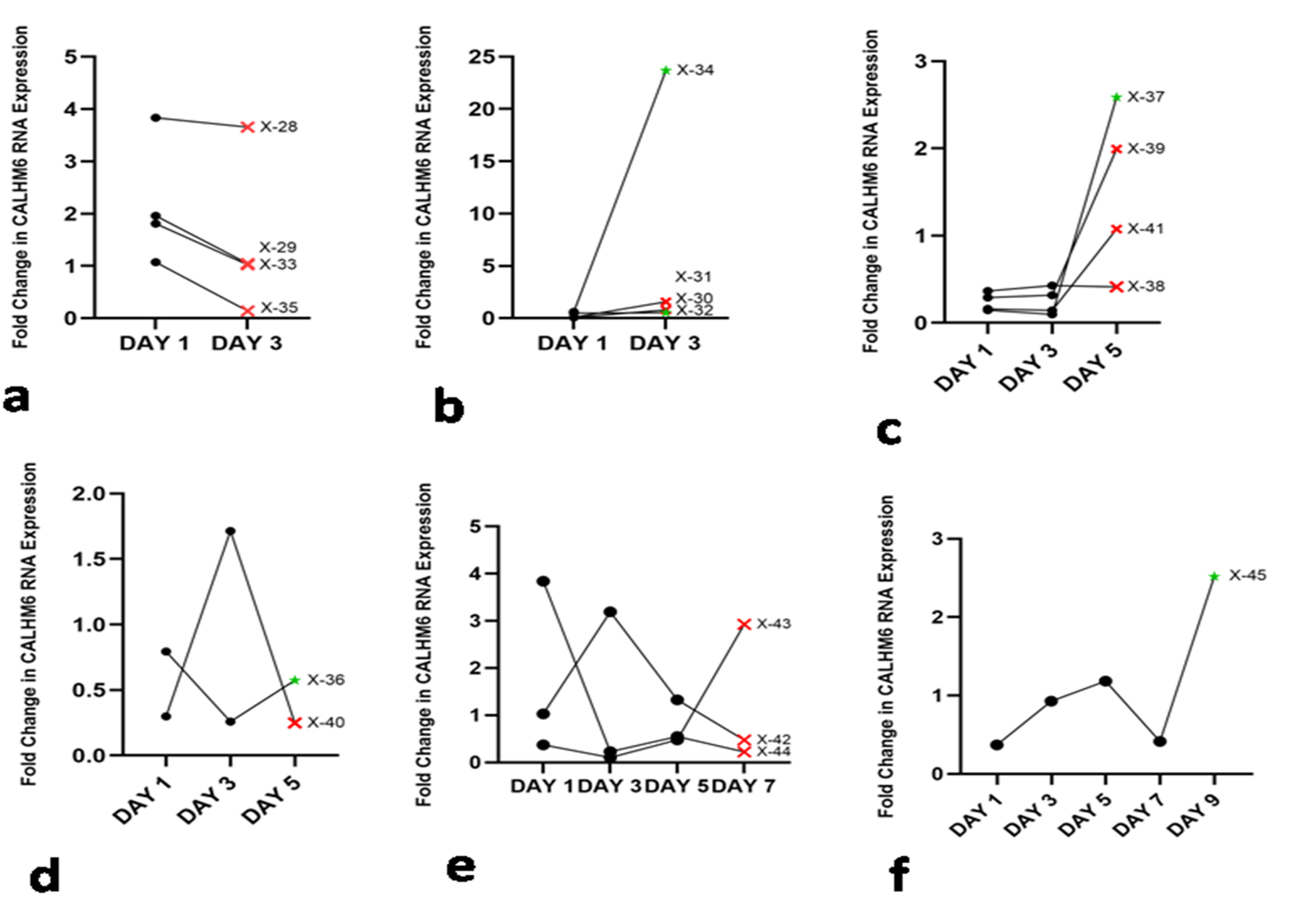 Figure 5. CALHM6 expression (qRT-PCR) on alternate days of hospitalization. The X-axis denotes days of hospitalization, while the Y-axis represents the fold change in CALHM6 mRNA expression. The follow up continued until the patients passed away (depicted as Red Cross) or were discharged from the hospital (depicted as green star). Panel (a) illustrates the fold change in CALHM6 mRNA level on Day 3 of hospitalization where the expression of CALHM6 in PBMCs of deceased X-28, X-29, X-33, and X-35 decreased on Day 3. Panel (b) indicates elevated CALHM6 expression in PBMCs of X-32 and X-34, resulting in discharge from the hospital. However, patients X-30 and X-31 also exhibited increased CALHM6 expression but did not survive. Panel (c) and (d) illustrate the fold change in CALHM6 mRNA level on Day 3 and Day 5 of hospitalization. In panel (c), the expression of CALHM6 in PBMCs of X-36 decreased on Day 3 and increased on Day 5, and the patient was discharged from the hospital. The expression of CALHM6 in PBMCs of X-40 increased on Day 3 and abruptly decreased on Day 5, the patient succumbed to the disease. Panel (d) shows that on Day 5, the expression of CALHM6 in PBMCs of X-37, X-38, X-39, and X-41 increased compared to Day 1, with only X-37 being discharged from the hospital. Panel (e) depicts the fold change in CALHM6 mRNA level on Days 3, 5, and 7 of hospitalization. On Day 7, the expression of CALHM6 in PBMCs of X-42 and X-44 decreased to the minimum levels compared to Day 1, while it increased in X-43. Fluctuating trend was observed throughout the follow-up and none of the patients survived. Panel (f) illustrates the expression of CALHM6 in PBMCs of X-45, which increased on Day 3 and Day 5; however, there was a sudden decrease on Day 7 and an abrupt elevation on Day 9 and the patient was discharged from the hospital.