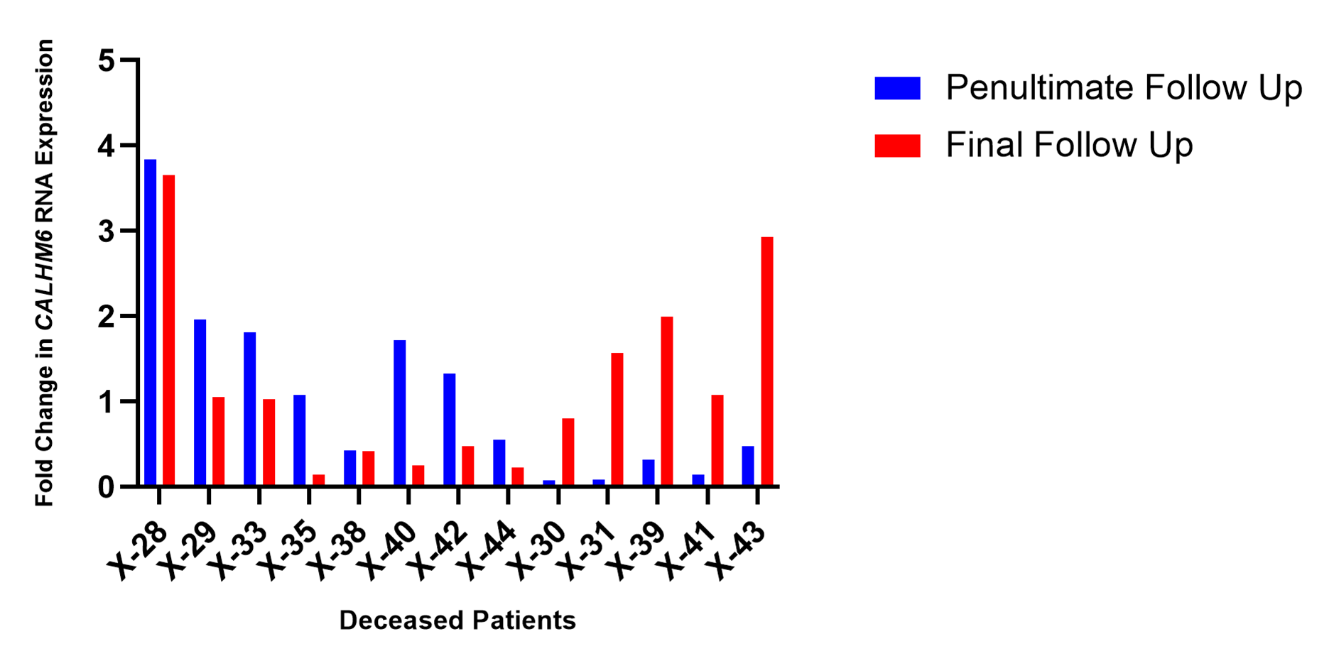 Figure 8. CALHM6 expression levels in PBMCs of deceased patients on penultimate day and final day of hospitalization (qRT-PCR). The expression level of CALHM6 in PBMCs of eight deceased patients (X-28, X-29, X-33, X-35, X-38, X-40, X-42, X-44) decreased compared to prior successive reading. Five patients (X-30, X-31, X-39, X-41 and X-43) recorded an increase of CALHM6 levels compared to prior successive reading.