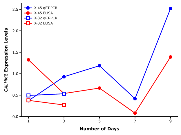 Figure 9. Comparison of qRT-PCR and ELISA readings throughout the follow up period. The qRT-PCR analysis revealed the expression of CALHM6 to be lower on Day 1 compared to Day 3 whereas ELISA concentration was observed to be higher on Day 1 compared to Day 3, for both X-45 and X-32. However, on Day 5, Day 7, and Day 9, the expression levels of CALHM6 observed through qRT-PCR and ELISA exhibited a similar trend. X-axis: Number of days. Y-axis: CALHM6 expression levels (Blue line qRT-PCR expression and red line ELISA concentration).