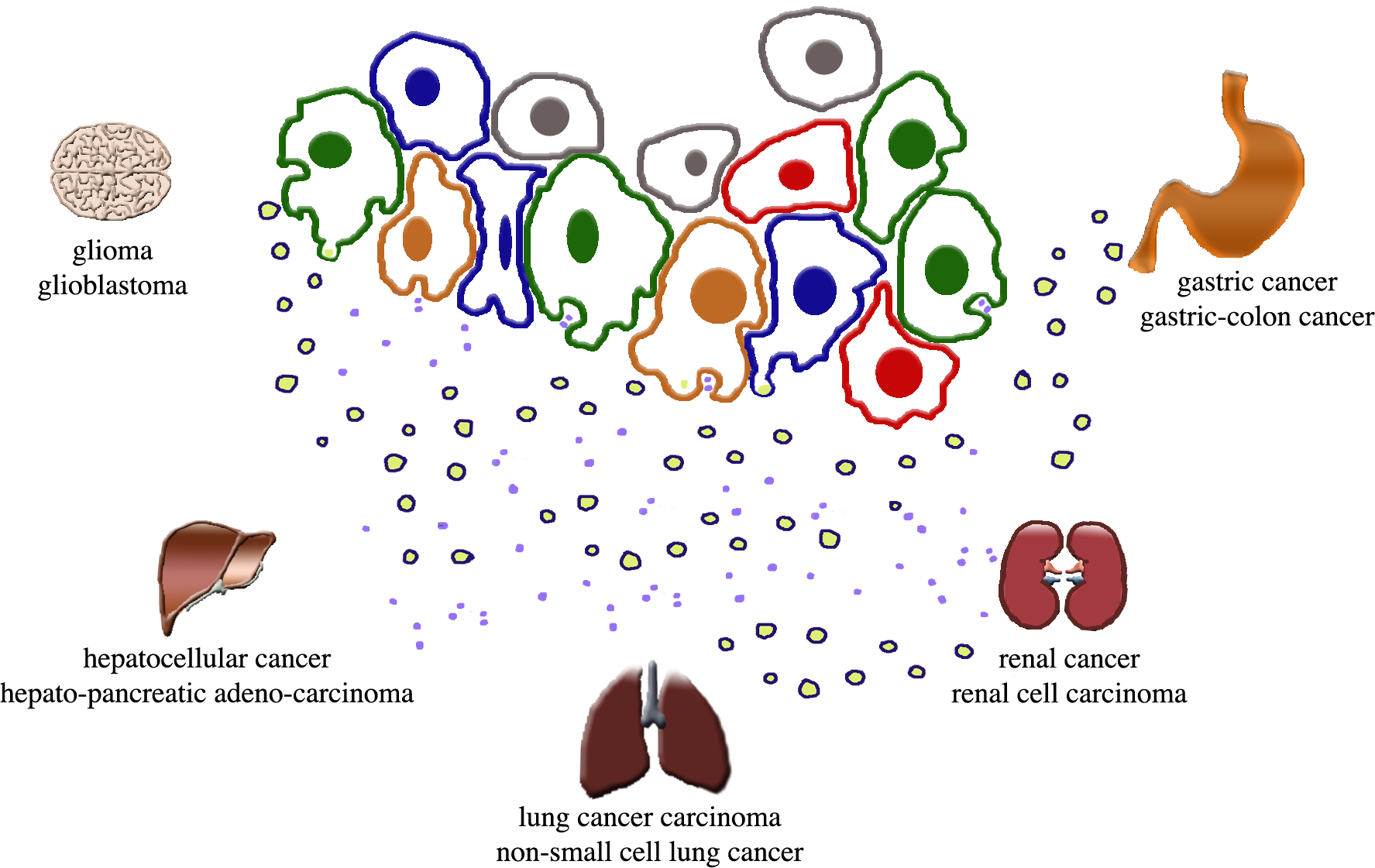 Figure 1. CSCs and associated cells of a niche are shown together with their released EVs. The names of the severe cancers governed by CSCs are reported near the images of their organs.