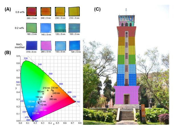 The reported results show that various PEDOT:PSS nanocomposite films on planar c-Si solar cells do produce various colors (Figure 2A). The CIE color coordinates showed that in comparison to 0.2 wt% Triton X-100 doping film, the color of 0.8 wt.% Triton X-100 doping films moves towards the red area with high color purity (Figure 2b). For the PEDOT:PSS-MoO3 nanocomposites, the colorselected range can expand to the blue-violet region with higher color saturation. Thus, a combination of thickness control and optical refractive index adjustment enables the fabrication of planar c-Si/PEDOT:PSS solar cells with vivid colors over a wide color gamut. These colorful c-Si cells could potentially be used as decorative solar panels on buildings as shown in Figure 2C (an old Bell Tower).