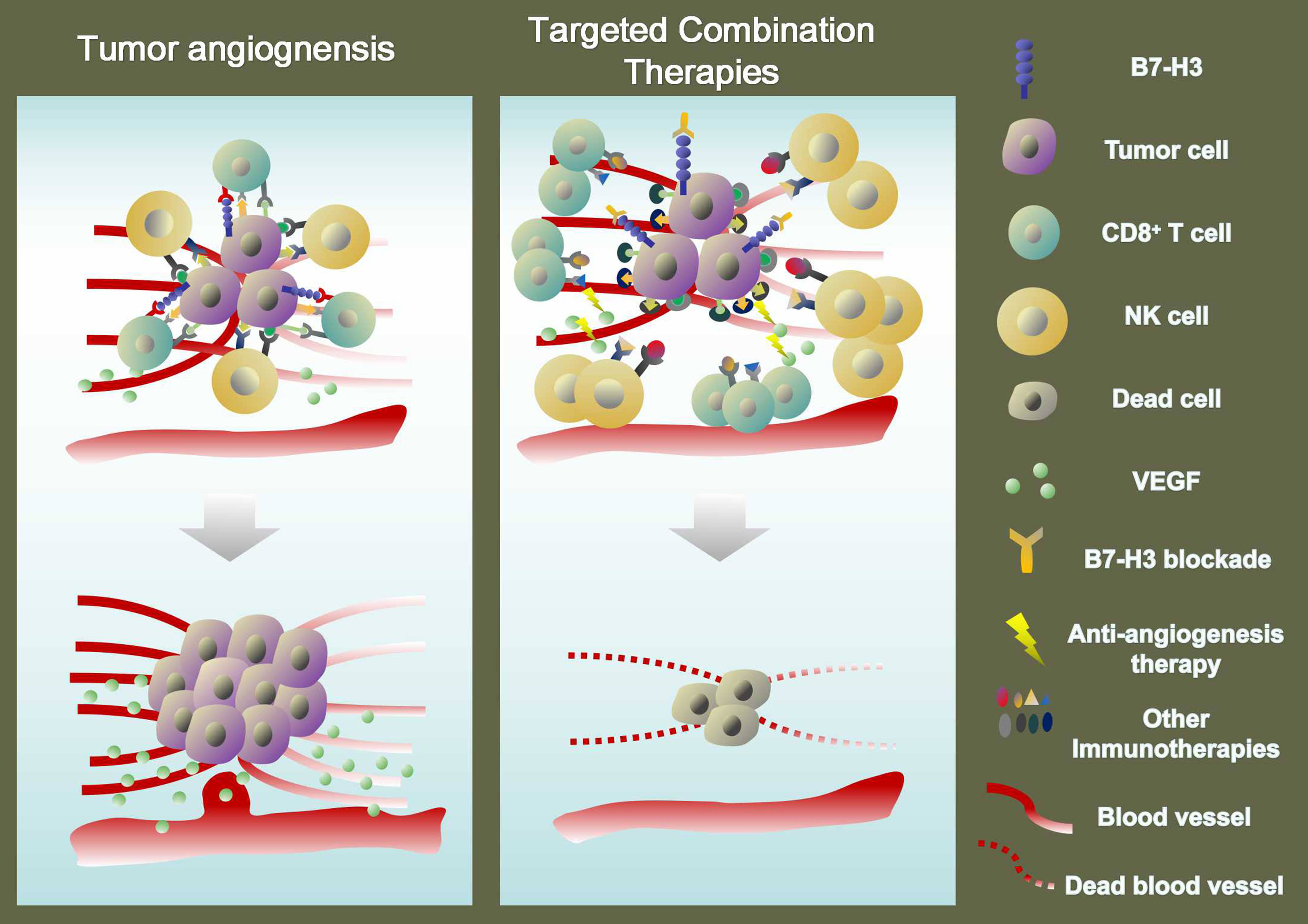 Nowadays, it is believed that combining an immune checkpoint inhibitor (ICI) with anti-angiogenesis would become a promising strategy, which can overcome the treatment resistance and finally improve patients’ prognosis [9]. We are aware that it seems to be a twoway street between anti-angiogenic therapies and immunotherapies, whose efficacy influence with each other [36]. Excessive levels of VEGF contribute to VEGFinduced immunosuppression in tumors [37]. The clinical success in the combination of VEGF inhibitors and ICI therapy attributed to the VEGF inhibitors, suppressing VEGF-induced immunosuppression and promoting an anti-tumor immune response [36]. Given that B7-H3 not only exerts crucial regulatory effects on the anti-tumor immune but also plays key roles in tumor angiogenesis, combination therapy with B7-H3 blockade and antiangiogenesis may be a particularly valuable option for the treatment of cancers. In our current research, we showed that the combination therapy of B7-H3 inhibitor 3E8 with bevacizumab inhibited the tumor growth, showing a more inhibitory effect on the MVD and VEGFA expression in mouse xenograft models (Figure 1). As such, it is expected that combination therapy with B7-H3 blockade and anti-angiogenesis is applied to the clinical treatment of tumors.