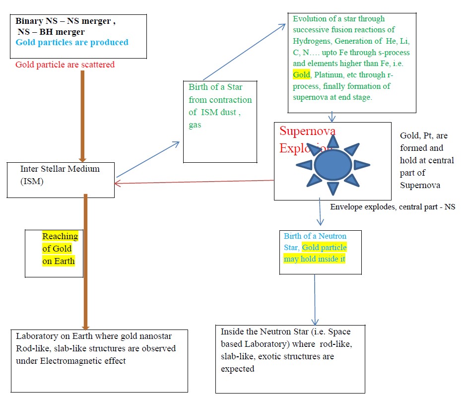 Figure 1. Schematic diagram showing the path of a gold particle (orange), generated from both binary NS-NS merger, NS-BH merger, and from supernova explosion (through stellar evolution) reaching to Earth via ISM as well as to hold inside the neutron star. It is expected that gold nanostar may be present inside the neutron star crust because of its exotic structures resembling those that are formed during laboratory experiments on earth.
