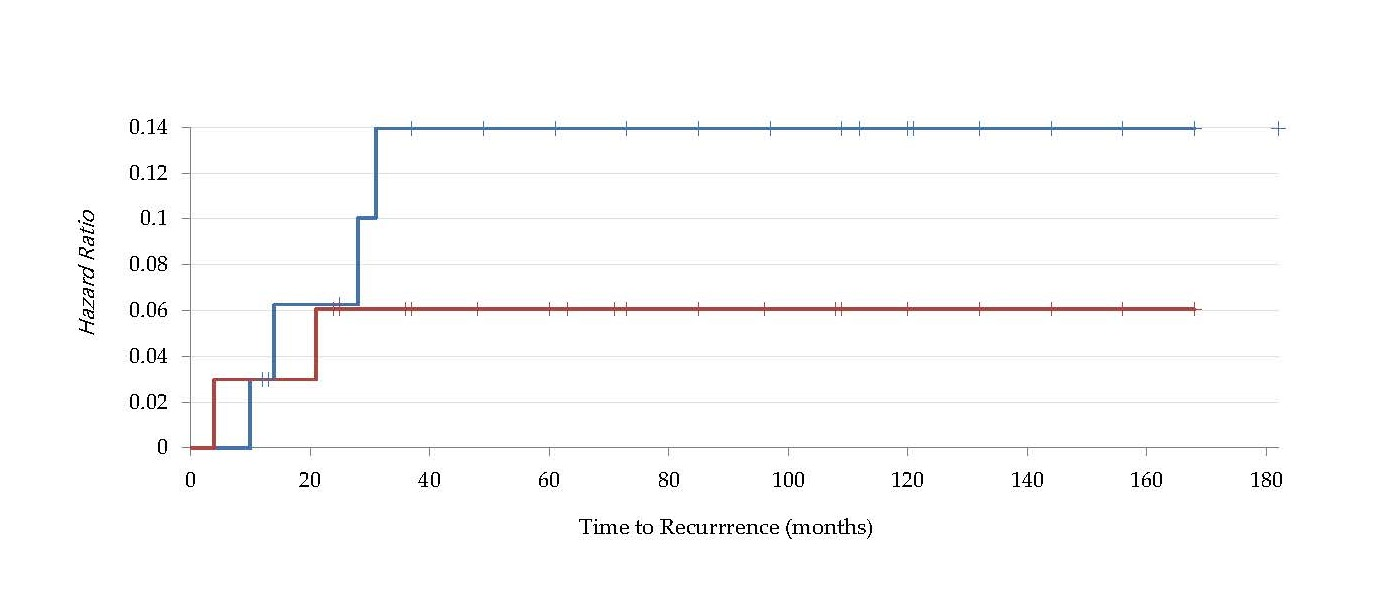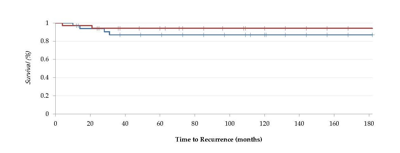 Analyzing the Hazard Ratio between the two groups we calculated a risk value for a positive USP-6 FISH to encounter a recurrence of 2,10 (LCL 0,424-UCL 10,47 (95%), this higher risk could be explained due to the limited amount of recurrence in our cohort (Figure 2).