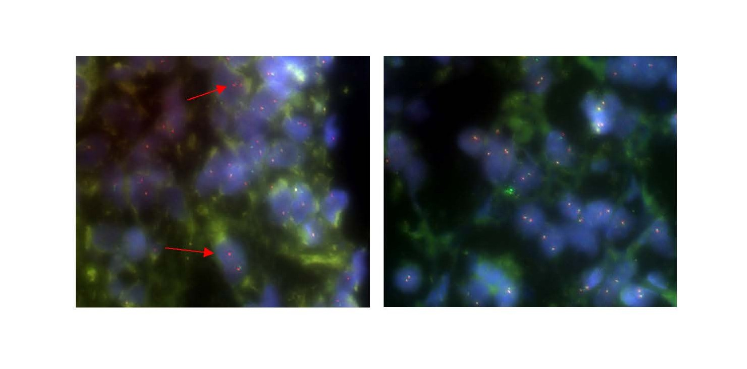Figure 3. Photos of one positive FISH for USP-6 analysis (on the left) and one negative FISH for USP-6 analysis (on the right).