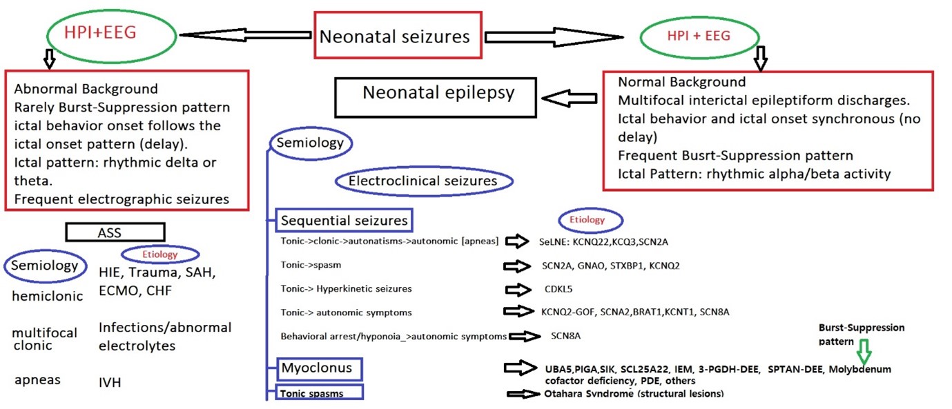 Introduction: Neonatal seizures are associated with neurodevelopmental impairments. Implementing long-term video-EEG monitoring in the neonatal intensive care unit became the gold standard for seizure diagnosis. During the neonatal period, seizures can be associated with an acute brain insult called acute symptomatic seizures (ASS) or being part of neonatal epilepsy that may have a structural, metabolic, or genetic cause. This distinction impacts patient workup and management. Objectives: To facilitate a guide to differentiate ASS from neonatal epilepsy, and to correlate different electroclinical seizure patterns with a specific etiology. Methods: A narrative review was performed. MEDLINE, Embase, and PubMed were used to gather data for this narrative review. The following keywords were applied to focus on original research and case reports: epileptic encephalopathy, developmental Epileptic encephalopathy and neonatal seizures, neonatal genetic encephalopathies, Otahara syndrome, neonatal channelopathies, and neonatal seizure classification. Conclusions: Strict electroclinical semiology is the backbone for diagnosing neonatal seizures. The EEG and ictal semiology help with the diagnosis and the treatment. The neonatal seizure classification should be expanded to include the EEG pattern. Lumping them in a better classificatory system will prevent unnecessary and hazardous medication.